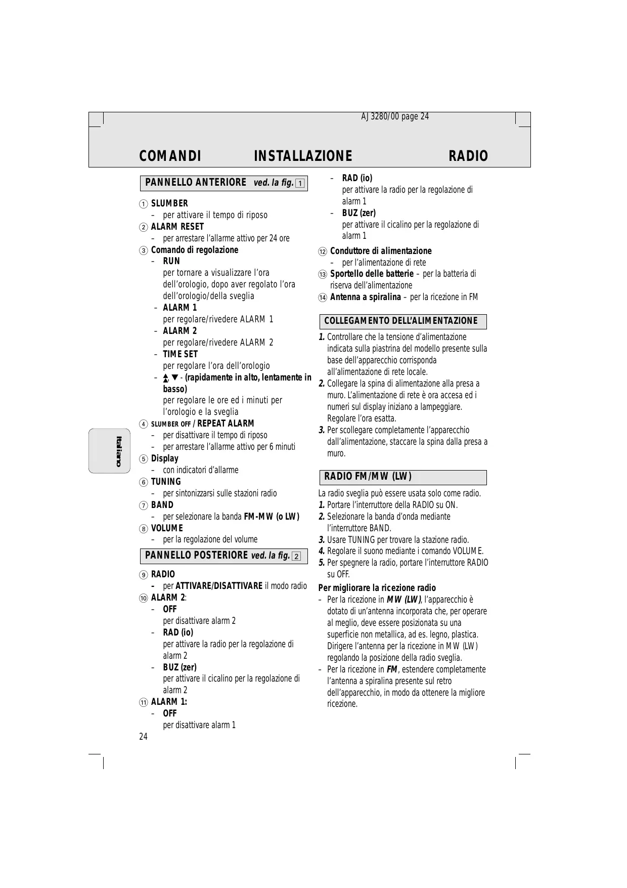 Scarica le istruzioni per il tuo Radio sveglia in formato PDF gratuitamente! Trova il tuo manuale AJ3280 - PHILIPS e riprendi in mano il tuo dispositivo elettronico. In questa pagina sono pubblicati tutti i documenti necessari per l'utilizzo del tuo dispositivo. AJ3280 del marchio PHILIPS.