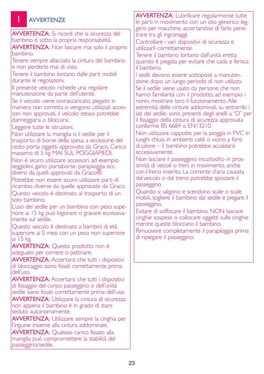 AVERTISSEMENT : Utilisez toujours la sangle d’entrejambe en combinaison avec le ceinturon. AVERTISSEMENT :Toute charge fixée sur la poignée affecte la stabilité de la poussette. AVERTISSEMENT : Lubrifiez régulièrement mais avec ménagement toutes les pièces mobiles avec une huile machine légère à usage général, en veillant à ce que l’huile pénètre entre les éléments là où ils se déplacent les uns par rapport aux autres pendant l’utilisation. Vérifiez les différents dispositifs de sécurité et utilisez-les correctement. Gardez votre enfant à l’écart de l’unité autonome pliée, afin qu’elle ne tombe pas et blesse votre enfant. Les poussettes doivent être entretenues après une longue période de non-utilisation. Si votre poussette est utilisée par une personne qui n’est pas familiarisée avec elle, par ex. des grands-parents, montrez-leur toujours comment elle fonctionne. Des anneaux en <<D>> sont prévus sur les extrémités des ceinturons, des deux côtés du siège, pour la fixation d’un harnais de sécurité homologué selon BS 6684 ou EN 13210. N’utilisez pas habillage pluie en PVC en intérieur, dans une atmosphère chaude ou près d’une source directe de chaleur : le bébé risque d’être incommodé par la chaleur. Ne lâchez pas votre poussette quand vous êtes près de véhicules routiers ou de trains en circulation. Même lorsque le frein est serré le déplacement d’air causé par le véhicule ou le train peut faire bouger une poussette à l’arrêt. Lorsque vous montez des escaliers ou des escalators, ou que vous en descendez, faites toujours descendre votre enfant et pliez la poussette. Evitez les risques de strangulation. N’ACCROCHEZ PAS des cordons sur votre poussette, et ne posez pas des objets munis de cordons sur votre enfant. Veuillez enlever complètement l’habillage pluie avant de plier la poussette.