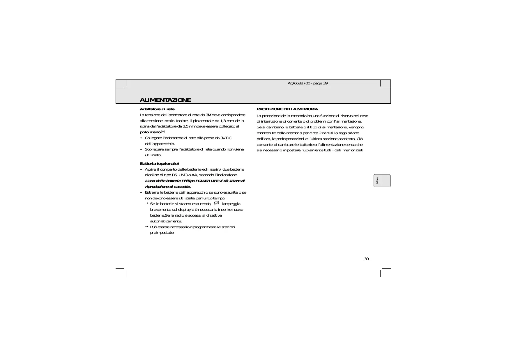 AQ 6688 /00 - page 39 ALIMENTAZIONE Adattatore di rete La tensione dell’adattatore di rete da 3V deve corrispondere alla tensione locale. Inoltre, il pin centrale da 1,3 mm. della spina dell’adattatore da 3,5 mm deve essere collegato al polo meno -.