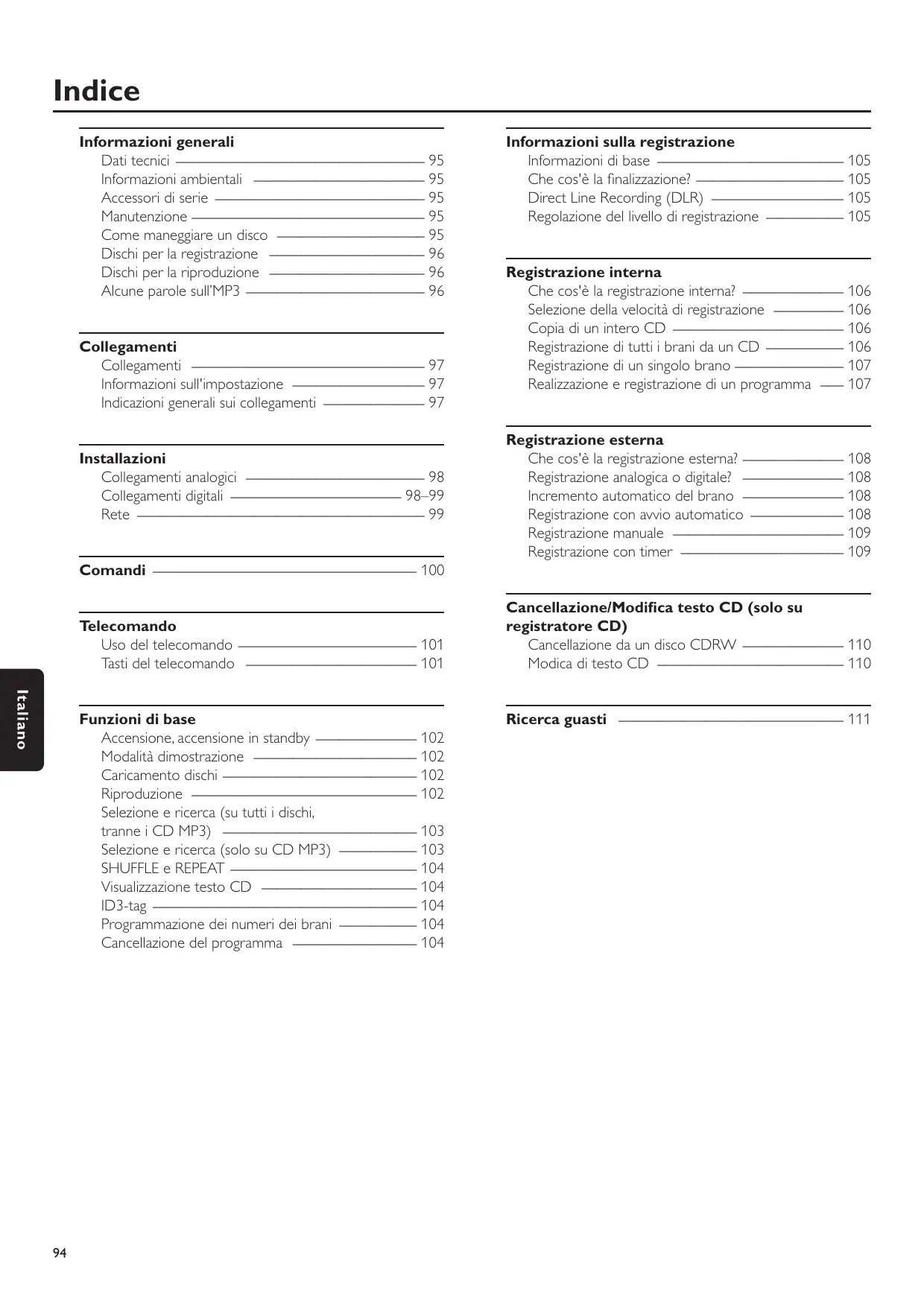 Indice Informazioni generali Dati tecnici ________________________________ 95 Informazioni ambientali ______________________ 95 Accessori di serie ___________________________ 95 Manutenzione ______________________________ 95 Come maneggiare un disco ___________________ 95 Dischi per la registrazione ____________________ 96 Dischi per la riproduzione ____________________ 96 Alcune parole sull’MP3 _______________________ 96 Collegamenti Collegamenti ______________________________ 97 Informazioni sull'impostazione _________________ 97 Indicazioni generali sui collegamenti _____________ 97 Installazioni Collegamenti analogici _______________________ 98 Collegamenti digitali ______________________ 98–99 Rete _____________________________________ 99 Comandi __________________________________ 100 Telecomando Uso del telecomando _______________________ 101 Tasti del telecomando ______________________ 101 Italiano Funzioni di base Accensione, accensione in standby _____________ 102 Modalità dimostrazione _____________________ 102 Caricamento dischi _________________________ 102 Riproduzione _____________________________ 102 Selezione e ricerca (su tutti i dischi, tranne i CD MP3) _________________________ 103 Selezione e ricerca (solo su CD MP3) __________ 103 SHUFFLE e REPEAT ________________________ 104 Visualizzazione testo CD ____________________ 104 ID3-tag __________________________________ 104 Programmazione dei numeri dei brani __________ 104 Cancellazione del programma ________________ 104