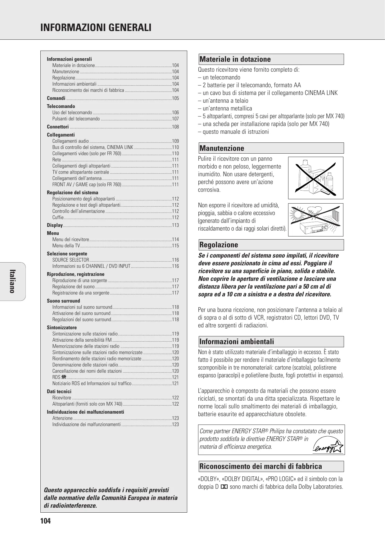 INFORMAZIONI GENERALI Informazioni generali Materiale in dotazione104 Manutenzione 104 Regolazione104 Informazioni ambientali 104 Riconoscimento dei marchi di fabbrica 104 Comandi 105 Telecomando Uso del telecomando 106 Pulsanti del telecomando 107 Connettori 108 Collegamenti Collegamenti audio 109 Bus di controllo del sistema, CINEMA LINK 110 Collegamenti video (solo per FR 760)110 Rete 111 Collegamenti degli altoparlanti 111 TV come altoparlante centrale 111 Collegamenti dell’antenna111 FRONT AV / GAME cap (solo FR 760)111 Regolazione del sistema Posizionamento degli altoparlanti 112 Regolazione e test degli altoparlanti112 Controllo dell’alimentazione 112 Cuffie112 Display113 Menu Menu del ricevitore114 Menu della TV115 Selezione sorgente SOURCE SELECTOR116 Informazioni su 6 CHANNEL / DVD INPUT116
