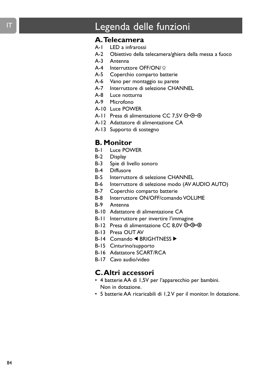 C. Altri accessori • 4 batterie AA di 1,5V per l’apparecchio per bambini. Non in dotazione. • 5 batterie AA ricaricabili di 1,2 V per il monitor. In dotazione.
