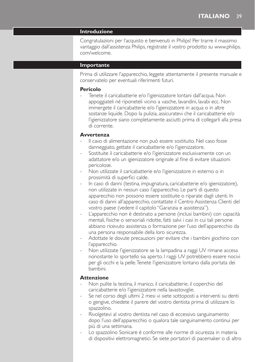 - Lo spazzolino Sonicare è conforme alle norme di sicurezza in materia di dispositivi elettromagnetic. Se siete portatori di pacemaker o di altri