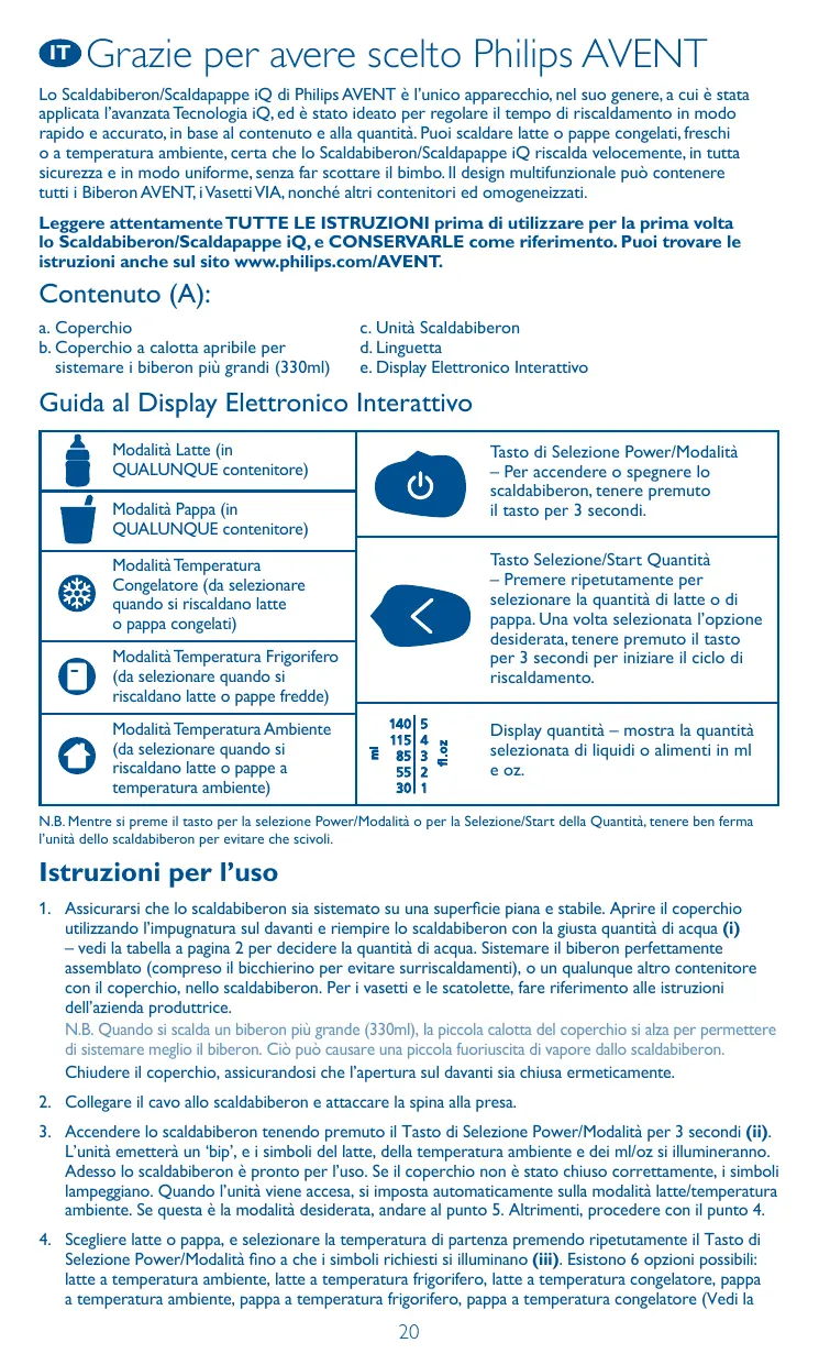 Grazie per avere scelto Philips AVENT Lo Scaldabiberon/Scaldapappe iQ di Philips AVENT è l’unico apparecchio, nel suo genere, a cui è stata applicata l’avanzata Tecnologia iQ, ed è stato ideato per regolare il tempo di riscaldamento in modo rapido e accurato, in base al contenuto e alla quantità. Puoi scaldare latte o pappe congelati, freschi o a temperatura ambiente, certa che lo Scaldabiberon/Scaldapappe iQ riscalda velocemente, in tutta sicurezza e in modo uniforme, senza far scottare il bimbo. Il design multifunzionale può contenere tutti i Biberon AVENT, i Vasetti VIA, nonché altri contenitori ed omogeneizzati. Leggere attentamente TUTTE LE ISTRUZIONI prima di utilizzare per la prima volta lo Scaldabiberon/Scaldapappe iQ, e CONSERVARLE come riferimento. Puoi trovare le istruzioni anche sul sito www.philips.com/AVENT. Contenuto (A): a. Coperchio b. Coperchio a calotta apribile per sistemare i biberon più grandi (330ml) c. Unità Scaldabiberon d. Linguetta e. Display Elettronico Interattivo Guida al Display Elettronico Interattivo Modalità Latte (in QUALUNQUE contenitore) Tasto di Selezione Power/Modalità – Per accendere o spegnere lo scaldabiberon, tenere premuto il tasto per 3 secondi. Modalità Pappa (in QUALUNQUE contenitore) Modalità Temperatura Ambiente (da selezionare quando si riscaldano latte o pappe a temperatura ambiente)
