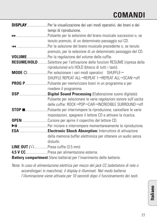 COMANDI DISPLAY......................Per la visualizzazione dei vari modi operativi, dei brani e dei tempi di riproduzione. § .................................Pulsante per la selezione del brano musicale successivo o, se tenuto premuto, di un determinato passaggio sul CD. ∞ .................................Per la selezione del brano musicale precedente o, se tenuto premuto, per la selezione di un determinato passaggio del CD. VOLUME......................Per la regolazione del volume delle cuffie. RESUME/HOLD ..........Selettore per l’attivazione delle funzioni RESUME (ripresa della riproduzione) e/o HOLD (blocco di tutti i tasti). MODE 0......................Per selezionare i vari modi operativi: SHUFFLE™ SHUFFLE REPEAT ALL™REPEAT 1™REPEAT ALL™SCAN™off PROG P........................Pulsante per memorizzare brani in un programma e per rivedere il programma. DSP ..............................Digital Sound Processing (Elaborazione suono digitale): Pulsante per selezionare le varie regolazioni sonore sull’uscita delle cuffie: ROCK™POP™CAR™INCREDIBLE SURROUND™off STOP 9........................Pulsante per interrompere la riproduzione, cancellare le varie impostazioni, spegnere il lettore CD e attivare la ricarica. OPEN ...........................Cursore per aprire il coperchio del lettore CD. 2; ................................Per iniziare e interrompere momentaneamente la riproduzione. ESA ..............................Electronic Shock Absorption: Interruttore di attivazione della memoria buffer elettronica per ottenere un audio senza disturbi. LINE OUT / p ..............Presa cuffie (3.5 mm) 4,5 V CC .......................Presa per alimentazione esterna. Battery compartment (Vano batteria) per l’inserimento delle batterie. Italiano Nota: In caso di alimentazione elettrica per mezzo del jack CC (adattatore di rete o accendisigari in macchina), il display è illuminati. Nel modo batteria l’illuminazione viene attivata per 10 secondi dopo il funzionamento dei tasti.