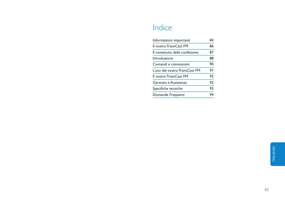 Consigliamo di dedicare del tempo allalettura del presente manuale prima di uscare il vostoTransCast FM. Il manuale contiene delle informazioni e annotazioni importanti riguardanti il funzionamento del vosto TransCast FM (DLV92009/10).