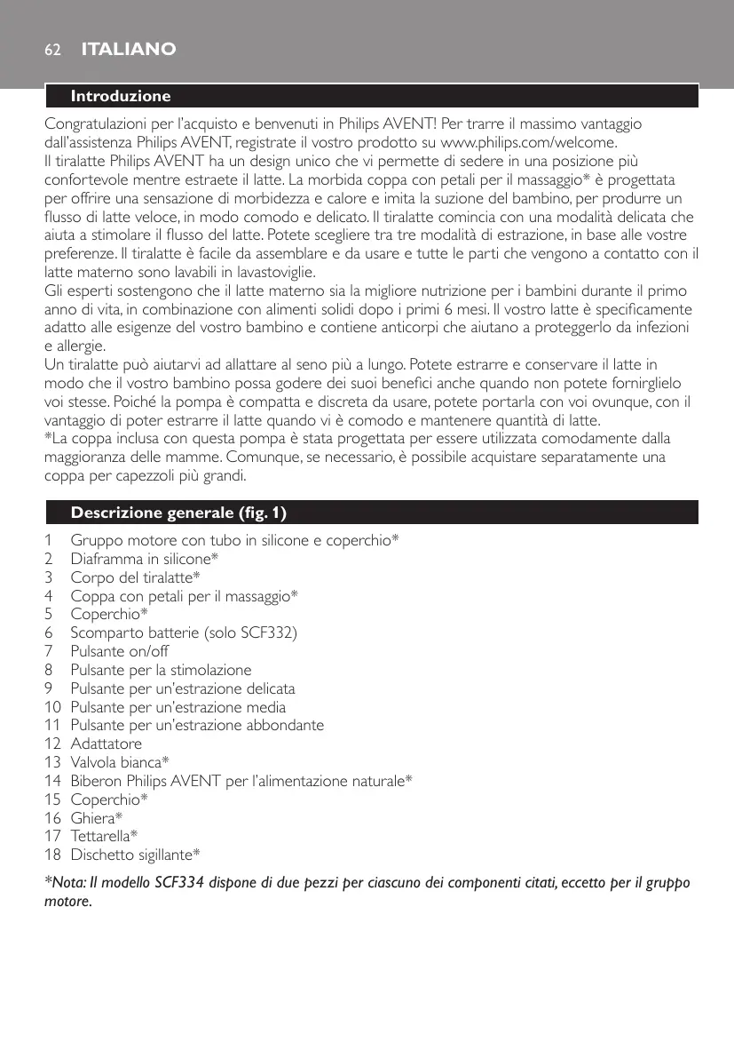 Gruppo motore con tubo in silicone e coperchio* Diaframma in silicone* Corpo del tiralatte* Coppa con petali per il massaggio* Coperchio* Scomparto batterie (solo SCF332) Pulsante on/off Pulsante per la stimolazione Pulsante per un’estrazione delicata Pulsante per un’estrazione media Pulsante per un’estrazione abbondante Adattatore Valvola bianca* Biberon Philips AVENT per l’alimentazione naturale* Coperchio* Ghiera* Tettarella* Dischetto sigillante* *Nota: Il modello SCF334 dispone di due pezzi per ciascuno dei componenti citati, eccetto per il gruppo motore. Italiano 63 Importante Prima di utilizzare il tiralatte, leggete attentamente il presente manuale dell’utente e conservatelo per eventuali riferimenti futuri.