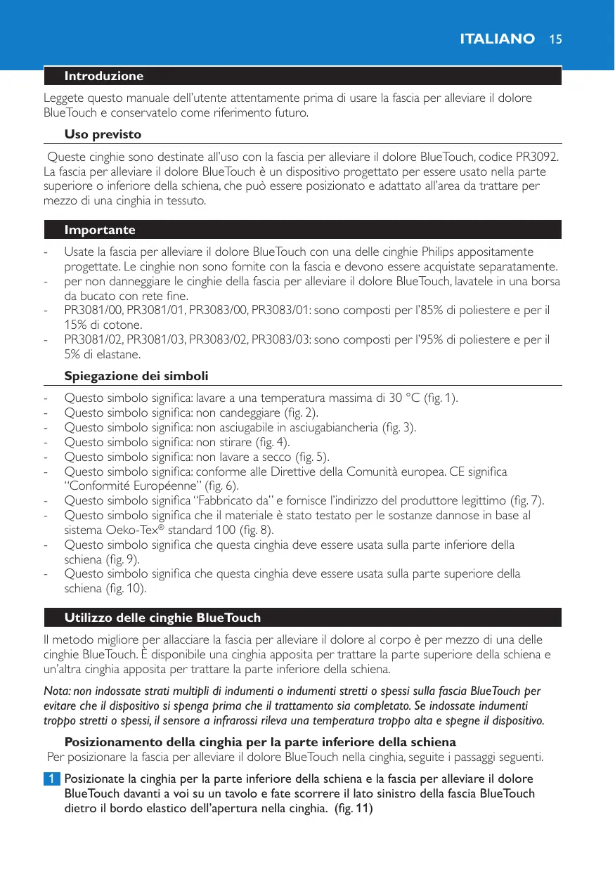 Questo simbolo significa: lavare a una temperatura massima di 30 °C (fig. 1). Questo simbolo significa: non candeggiare (fig. 2). Questo simbolo significa: non asciugabile in asciugabiancheria (fig. 3). Questo simbolo significa: non stirare (fig. 4). Questo simbolo significa: non lavare a secco (fig. 5). Questo simbolo significa: conforme alle Direttive della Comunità europea. CE significa “Conformité Européenne” (fig. 6). Questo simbolo significa “Fabbricato da” e fornisce l’indirizzo del produttore legittimo (fig. 7). Questo simbolo significa che il materiale è stato testato per le sostanze dannose in base al sistema Oeko-Tex® standard 100 (fig. 8). Questo simbolo significa che questa cinghia deve essere usata sulla parte inferiore della schiena (fig. 9). Questo simbolo significa che questa cinghia deve essere usata sulla parte superiore della schiena (fig. 10). Utilizzo delle cinghie BlueTouch Il metodo migliore per allacciare la fascia per alleviare il dolore al corpo è per mezzo di una delle cinghie BlueTouch. È disponibile una cinghia apposita per trattare la parte superiore della schiena e un’altra cinghia apposita per trattare la parte inferiore della schiena. Nota: non indossate strati multipli di indumenti o indumenti stretti o spessi sulla fascia BlueTouch per evitare che il dispositivo si spenga prima che il trattamento sia completato. Se indossate indumenti troppo stretti o spessi, il sensore a infrarossi rileva una temperatura troppo alta e spegne il dispositivo. Posizionamento della cinghia per la parte inferiore della schiena Per posizionare la fascia per alleviare il dolore BlueTouch nella cinghia, seguite i passaggi seguenti. 1 Posizionate la cinghia per la parte inferiore della schiena e la fascia per alleviare il dolore BlueTouch davanti a voi su un tavolo e fate scorrere il lato sinistro della fascia BlueTouch dietro il bordo elastico dell’apertura nella cinghia. (fig. 11)