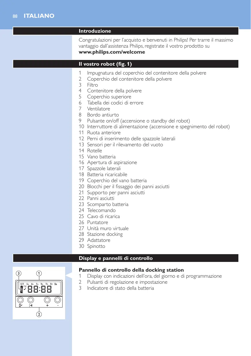 ITALIANO Introduzione Congratulazioni per l’acquisto e benvenuti in Philips! Per trarre il massimo vantaggio dall’assistenza Philips, registrate il vostro prodotto su www.philips.com/welcome Il vostro robot (fig. 1)