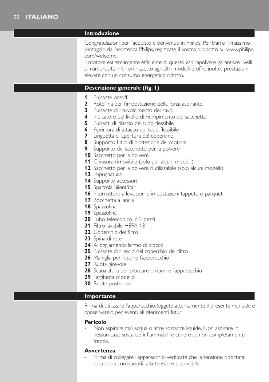 2 Vacíe el contenido en el cubo de la basura. 3 Para cerrar la bolsa deslice de nuevo el clip por el borde inferior de la bolsa. Limpieza y mantenimiento de los filtros Desenchufe siempre el aparato antes de limpiar o sustituir los filtros. Filtro permanente protector del motor Limpie el filtro permanente protector del motor cada vez que vacíe la bolsa reutilizable o sustituya la bolsa desechable. Guía de resolución de problemas En este capítulo se resumen los problemas más frecuentes que pueden surgir. Si no puede resolver el problema con la siguiente información, póngase en contacto con el Servicio de Atención al Cliente de su país. 1 La potencia de succión es insuficiente. A Puede que la potencia de succión esté establecida en un nivel demasiado bajo. -- Aumente la potencia de succión. B Puede que el cepillo, el tubo o la manguera estén obstruidos. -- Para eliminar la obstrucción, desconecte la pieza obstruida y conéctela al revés (en la medida que sea posible). Ponga en marcha el aspirador para hacer que el aire pase a través de la pieza obstruida en dirección contraria. C Puede que la bolsa del polvo esté llena. -- Vacíe la bolsa reutilizable (sólo en modelos específicos) o sustituya la bolsa desechable. D Puede que los filtros estén sucios. -- Limpie o cambie los filtros. 2 Cuando utilizo la aspiradora a veces siento descargas eléctricas. A El aspirador ha creado electricidad estática. Cuanto más bajo es el nivel de humedad en las habitaciones, más electricidad estática crea el aparato. Boutons de déverrouillage du flexible Orifice de raccordement du flexible Languette de déverrouillage du couvercle Porte-filtre de protection du moteur Support du sac Sac Brosse amovible (certains modèles uniquement) Sac réutilisable (certains modèles uniquement) Bouton de déverrouillage du couvercle du filtre Poignée de rangement Roulette pivotante Insert de rangement Plaque signalétique Roulettes arrière (notamment des enfants) dont les capacités physiques, sensorielles ou intellectuelles sont réduites, ou par des personnes manquant d’expérience ou de connaissances, à moins que celles-ci ne soient sous surveillance ou qu’elles n’aient reçu des instructions quant à l’utilisation de l’appareil par une personne responsable de leur sécurité. -- Veillez à ce que les enfants ne puissent pas jouer avec l’appareil. -- Ne dirigez pas le flexible, le tube ou tout autre accessoire vers les yeux ou les oreilles et ne les placez pas dans votre bouche lorsqu’ils sont raccordés à l’aspirateur et que celui-ci est sous tension. Attention -- Lorsque vous aspirez des cendres, du sable fin, de la chaux, de la poussière de ciment ou d’autres substances similaires, les pores du sac se bouchent et le voyant de sac plein s’allume pour indiquer que le sac est plein. Remplacez le sac jetable ou videz le sac réutilisable même s’ils ne sont pas encore pleins (voir le chapitre « Remplacement/vidage du sac »). -- N’utilisez jamais l’appareil sans le filtre de protection du moteur. Vous risqueriez d’endommager le moteur et de réduire la durée de vie de l’appareil. -- Utilisez uniquement les sacs Philips Classic S-bag ` ou le sac réutilisable fourni (dans certains pays uniquement). -- Lors de l’aspiration, notamment dans des pièces où l’air est peu humide, l’aspirateur produit de l’électricité statique. Lorsque vous touchez le tube ou d’autres parties en acier de l’aspirateur, vous pouvez par conséquent ressentir de légères décharges électriques sans danger pour votre santé et l’appareil. Pour réduire ce désagrément, nous vous conseillons : 1 de décharger l’appareil en plaçant fréquemment le tube contre d’autres objets métalliques de la pièce (par exemple, des pieds de table ou de chaise, un radiateur, etc.) ; 2 d’augmenter le niveau d’humidité de l’air dans la pièce en y plaçant de l’eau, par exemple dans un humidificateur suspendu à vos radiateurs ou des bols posés dessus ou à proximité.