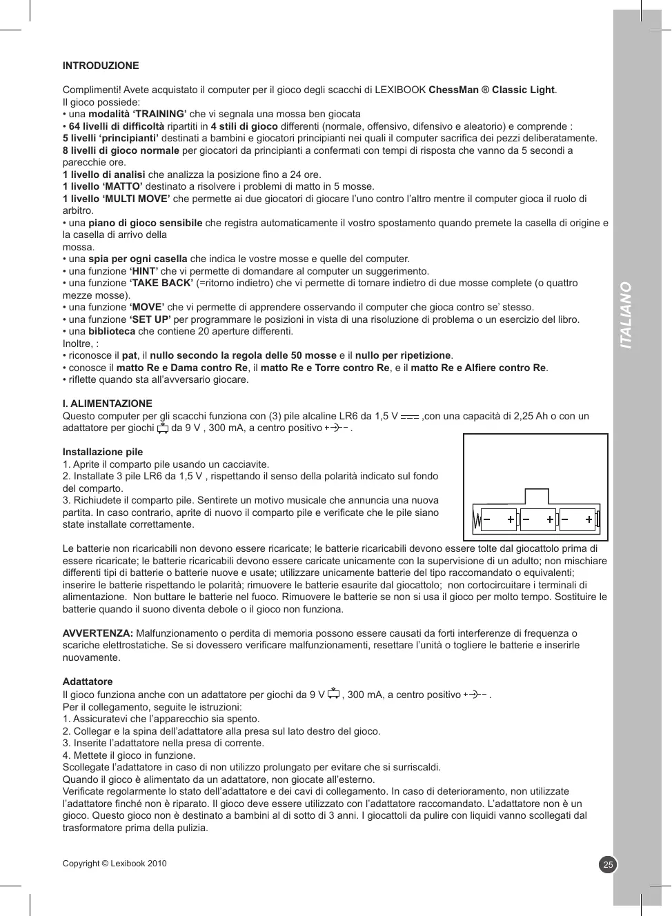 1. Ouvrez le couvercle du compartiment à piles à l’aide d’un tournevis. 2. Installez 3 piles LR6 de 1,5 V en respectant le sens des polarités indiqué au fond du compartiment. 3. Refermez le compartiment à piles. Vous devez alors entendre la petite musique annonçant une nouvelle partie. Dans le cas contraire, ouvrez à nouveau le compartiment à piles et vérifiez que les piles sont correctement installées. Ne pas recharger les piles non rechargeables. Retirer les accumulateurs du jeu avant de les recharger. Ne charger les accumulateurs que sous la surveillance d’un adulte. Ne pas mélanger différents types de piles ou accumulateurs, ou des piles et accumulateurs neufs et usagés. Les piles et accumulateurs doivent être mis en place en respectant la polarité. Les piles et accumulateurs usagés doivent être enlevés du jouet. Les bornes d’une pile ou d’un accumulateur ne doivent pas être mises en court-circuit. Ne pas jeter les piles au feu. Retirer les piles en cas de non utilisation prolongée. ATTENTION : D’importantes interférences électromagnétiques ou des décharges électrostatiques peuvent provoquer un dysfonctionnement ou une perte de données. Si le produit ne fonctionne pas correctement, enlevez puis remettez les piles. Adaptateur Le jeu fonctionne aussi avec un adaptateur pour jouets de 9 V , 300 mA, à centre positif . Pour le branchement, suivez ces instructions : 1. Assurez-vous que l’appareil est éteint. 2. Branchez la fiche de l’adaptateur dans la prise située sur le côté droit du jeu. 3. Branchez l’adaptateur dans une prise de courant. 4. Mettez le jeu en marche. Débranchez l’adaptateur en cas de non-utilisation prolongée afin d’éviter tout échauffement. Lorsque le jeu est alimenté par un adaptateur, ne jouez pas à l’extérieur. Vérifiez régulièrement l’état de l’adaptateur et des fils de branchement. En cas de détérioration, n’utilisez pas l’adaptateur jusqu’à réparation. Le jeu ne doit être utilisé qu’avec l’adaptateur recommandé. Copyright © Lexibook 2010