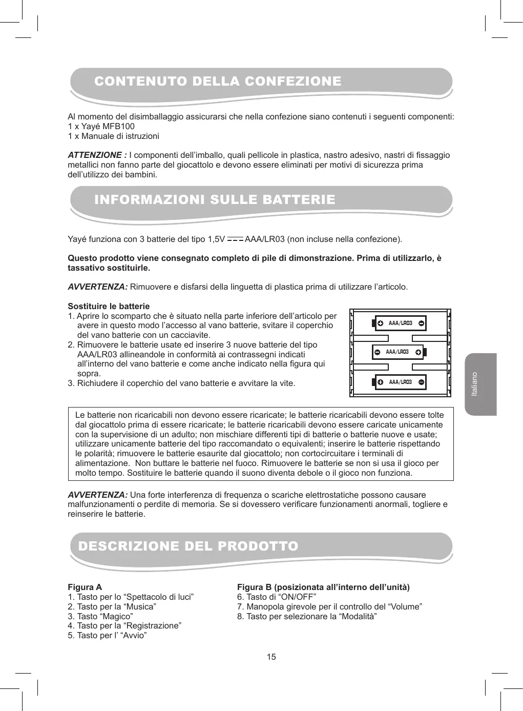 Le batterie non ricaricabili non devono essere ricericate; le batterie ricaricabili devono essere tolte dal giocattolo prima di essere ricaricate; le batterie ricaricabili devono essere caricate unicamente con la supervisione di un adulto; non mischiare differenti tipi di batterie o batterie nuove e usate; utilizzare unicamente batterie del tipo raccommando o equivalenti; inseire le batterie rispettoando le polarità; rimuovere le batterie esaurite dal giocattolo; non cortocircuitare i terminali di alimentazione. Non buttare le batterie nel fuoco. Rimuovere le batterie se non si usa il gioco per molto tempo. Sostituire le batterie quando il suono diventa debole o il gioco non funziona.