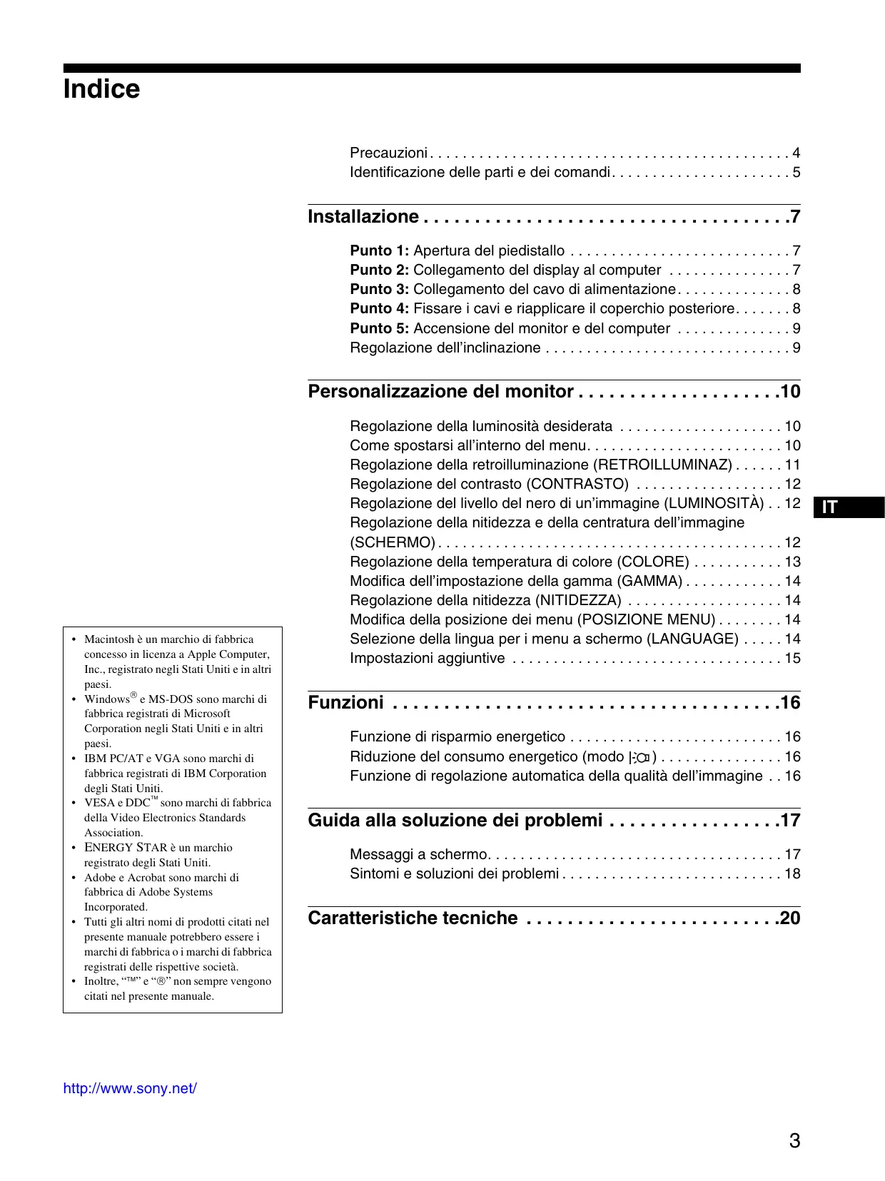 • Macintosh è un marchio di fabbrica concesso in licenza a Apple Computer, Inc., registrato negli Stati Uniti e in altri paesi. • Windows e MS-DOS sono marchi di fabbrica registrati di Microsoft Corporation negli Stati Uniti e in altri paesi. • IBM PC/AT e VGA sono marchi di fabbrica registrati di IBM Corporation degli Stati Uniti. • VESA e DDC sono marchi di fabbrica della Video Electronics Standards Association. • ENERGY STAR è un marchio registrato degli Stati Uniti. • Adobe e Acrobat sono marchi di fabbrica di Adobe Systems Incorporated. • Tutti gli altri nomi di prodotti citati nel presente manuale potrebbero essere i marchi di fabbrica o i marchi di fabbrica registrati delle rispettive società. • Inoltre, “” e “” non sempre vengono citati nel presente manuale.