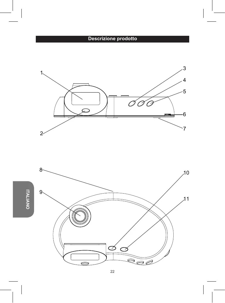 7. Compartiment à piles (sous l’appareil) 8. Antenne radio 9. Projecteur 10. SCAN: Rechercher des stations radio. 11. RESET: Réinitialiser la fréquence radio pour lancer une nouvelle recherche de stations. 3. Réglez les minutes à l’aide de la touche ADJUST, puis appuyez sur SET pour passer au réglage suivant. Les réglages s’effectuent dans l’ordre suivant: Minutes Heures Date CONSEIL: Maintenez enfoncée la touche ADJUST pour passer plus rapidement d’un réglage à l’autre. Date et heure d’alarme: En mode horloge, maintenez enfoncée la touche ADJUST pour regarder la date et maintenez enfoncée la touche SET pour vérifier l’heure de l’alarme. ALARME 1. Pour régler l’alarme, appuyez 2 fois sur MODE. 2. Réglez l’heure à l’aide de la touche ADJUST, puis appuyez sur SET pour passer au réglage suivant. 3. Réglez les minutes à l’aide de la touche ADJUST, puis appuyez sur MODE pour confirmer. 4. Lorsque l’alarme retentit, appuyez sur ADJUST pour la repousser de 5 minutes, ou sur SET pour l’éteindre complètement. L’alarme retentira à nouveau le lendemain à la même heure. Activer ou désactiver l’alarme: En mode horloge, appuyez simultanément sur SET et sur ADJUST. Le symbole apparaît à l’écran, indiquant que l’alarme est activée.