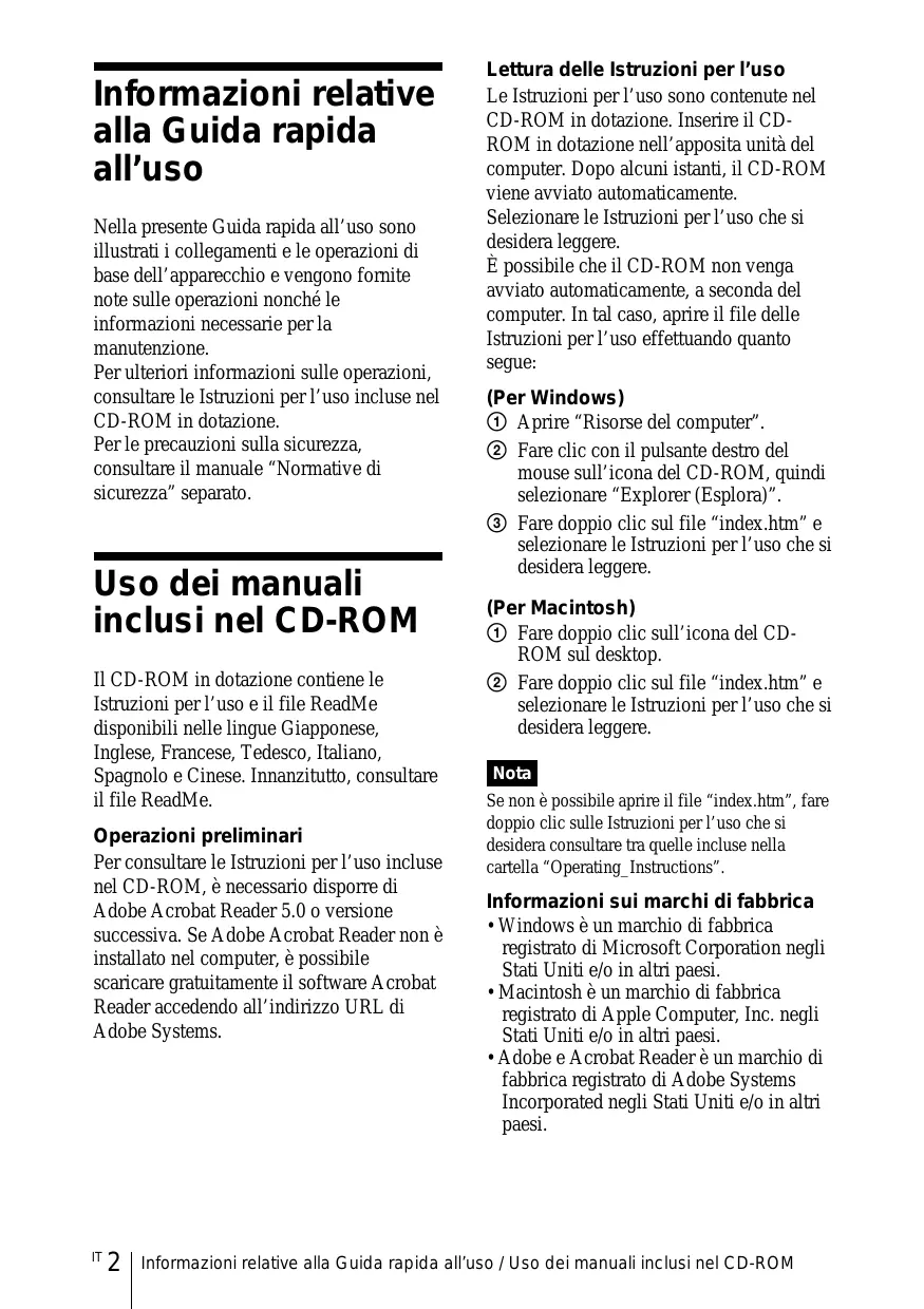 Lettura delle Istruzioni per l’uso Le Istruzioni per l’uso sono contenute nel CD-ROM in dotazione. Inserire il CDROM in dotazione nell’apposita unità del computer. Dopo alcuni istanti, il CD-ROM viene avviato automaticamente. Selezionare le Istruzioni per l’uso che si desidera leggere. È possibile che il CD-ROM non venga avviato automaticamente, a seconda del computer. In tal caso, aprire il file delle Istruzioni per l’uso effettuando quanto segue: (Per Windows) 1 Aprire “Risorse del computer”. 2 Fare clic con il pulsante destro del mouse sull’icona del CD-ROM, quindi selezionare “Explorer (Esplora)”. 3 Fare doppio clic sul file “index.htm” e selezionare le Istruzioni per l’uso che si desidera leggere. (Per Macintosh) 1 Fare doppio clic sull’icona del CDROM sul desktop. 2 Fare doppio clic sul file “index.htm” e selezionare le Istruzioni per l’uso che si desidera leggere. Nota Se non è possibile aprire il file “index.htm”, fare doppio clic sulle Istruzioni per l’uso che si desidera consultare tra quelle incluse nella cartella “Operating_Instructions”. Informazioni sui marchi di fabbrica