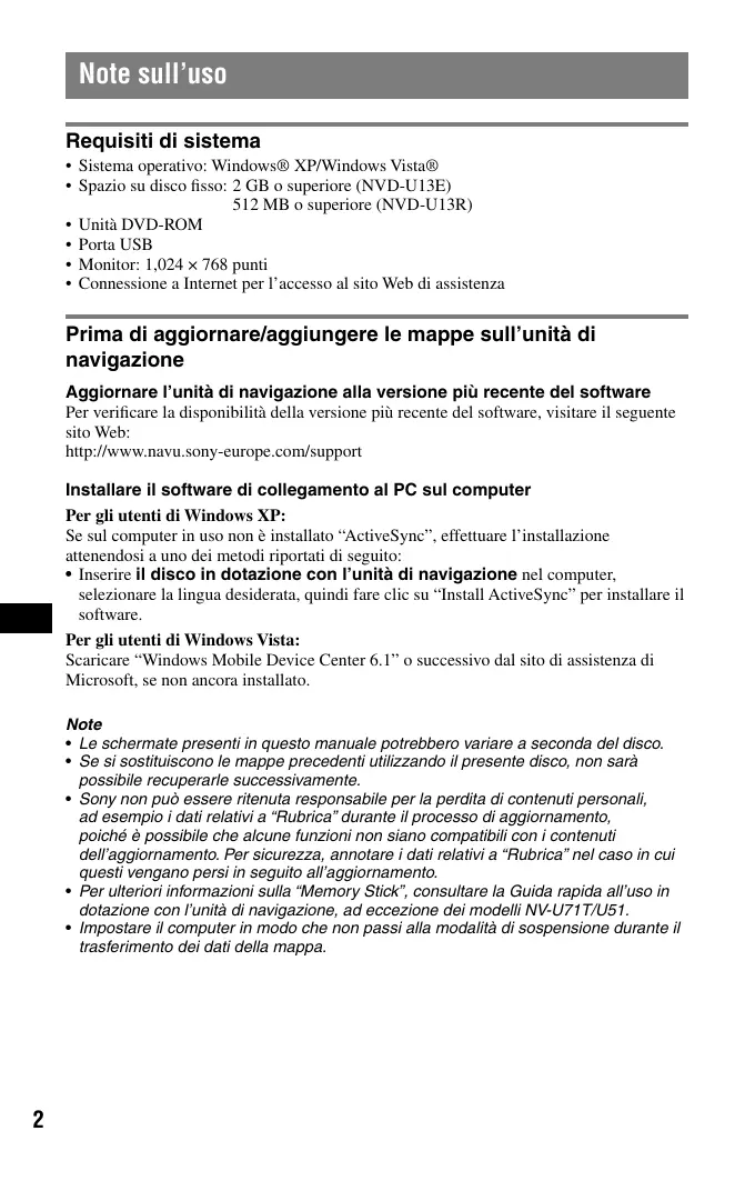 - Connessione a Internet per l’accesso al sito Web di assistenza Prima di aggiornare/aggiungere le mappe sull’unità di navigazione Aggiornare l’unità di navigazione alla versione più recente del software Per verificare la disponibilità della versione più recente del software, visitare il seguente sito Web: http://www.navu.sony-europe.com/support Installare il software di collegamento al PC sul computer Per gli utenti di Windows XP: Se sul computer in uso non è installato “ActiveSync”, effettuare l’installazione attenendosi a uno dei metodi riportati di seguito: