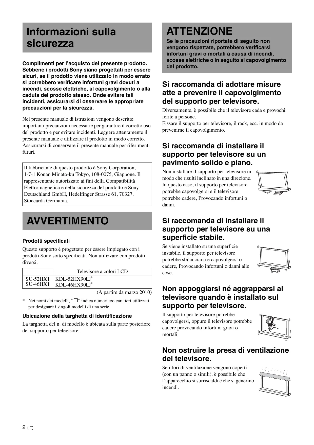 8 (NL) Informazioni sulla sicurezza Complimenti per l’acquisto del presente prodotto. Sebbene i prodotti Sony siano progettati per essere sicuri, se il prodotto viene utilizzato in modo errato si potrebbero verificare infortuni gravi dovuti a incendi, scosse elettriche, al capovolgimento o alla caduta del prodotto stesso. Onde evitare tali incidenti, assicurarsi di osservare le appropriate precauzioni per la sicurezza. Nel presente manuale di istruzioni vengono descritte importanti precauzioni necessarie per garantire il corretto uso del prodotto e per evitare incidenti. Leggere attentamente il presente manuale e utilizzare il prodotto in modo corretto. Assicurarsi di conservare il presente manuale per riferimenti futuri. Il fabbricante di questo prodotto è Sony Corporation, 1-7-1 Konan Minato-ku Tokyo, 108-0075, Giappone. Il rappresentante autorizzato ai fini della Compatibilità Elettromagnetica e della sicurezza del prodotto è Sony Deutschland GmbH, Hedelfinger Strasse 61, 70327, Stoccarda Germania. AVVERTIMENTO Prodotti specificati Questo supporto è progettato per essere impiegato con i prodotti Sony sotto specificati. Non utilizzare con prodotti diversi. SU-52HX1 SU-46HX1 Televisore a colori LCD KDL-52HX90s* KDL-46HX90s* (A partire da marzo 2010)