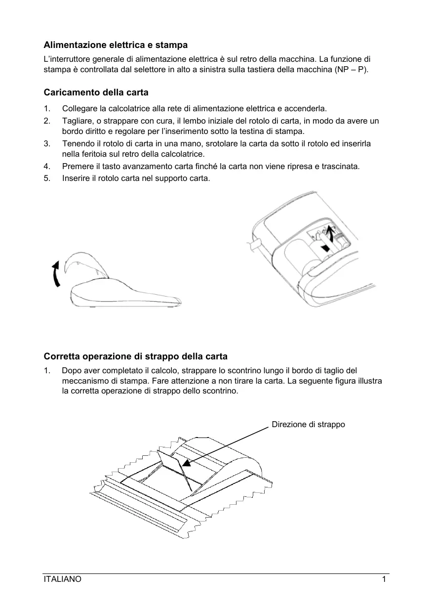 Collegare la calcolatrice alla rete di alimentazione elettrica e accenderla. Tagliare, o strappare con cura, il lembo iniziale del rotolo di carta, in modo da avere un bordo diritto e regolare per l’inserimento sotto la testina di stampa. Tenendo il rotolo di carta in una mano, srotolare la carta da sotto il rotolo ed inserirla nella feritoia sul retro della calcolatrice. Premere il tasto avanzamento carta finché la carta non viene ripresa e trascinata. Inserire il rotolo carta nel supporto carta. Corretta operazione di strappo della carta