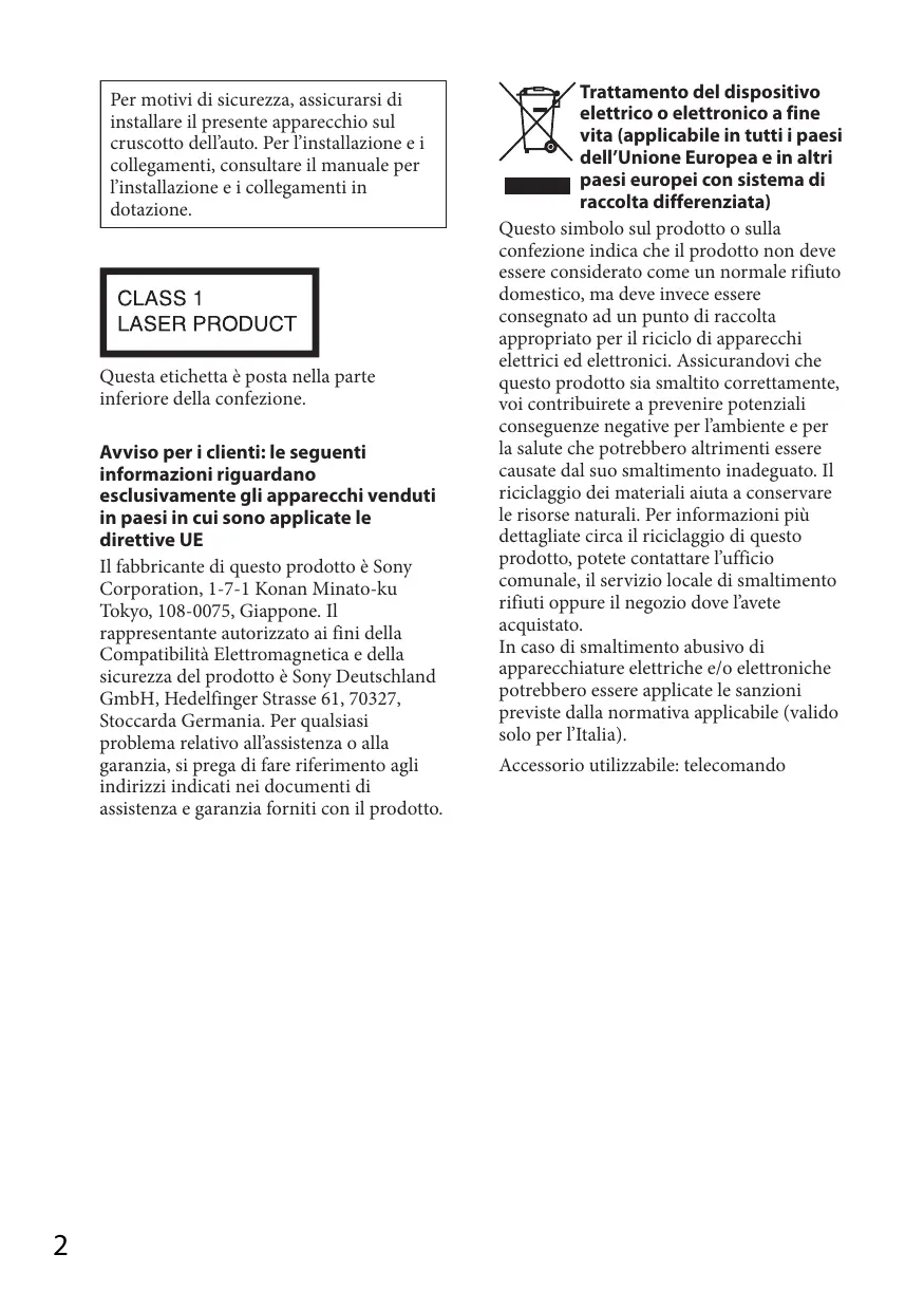 Avis à l’attention des clients : les informations suivantes s’appliquent uniquement aux appareils vendus dans des pays qui appliquent les directives de l’Union Européenne Le fabricant de ce produit est Sony Corporation, 1-7-1 Konan Minato-ku Tokyo, 108-0075 Japon. Le représentant autorisé pour les questions de compatibilité électromagnétique (EMC) et la sécurité des produits est Sony Deutschland GmbH, Hedelfinger Strasse 61, 70327 Stuttgart, Allemagne. Pour toute question relative au SAV ou à la garantie, merci de bien vouloir vous référer aux coordonnées contenues dans les documents relatifs au SAV ou la garantie.