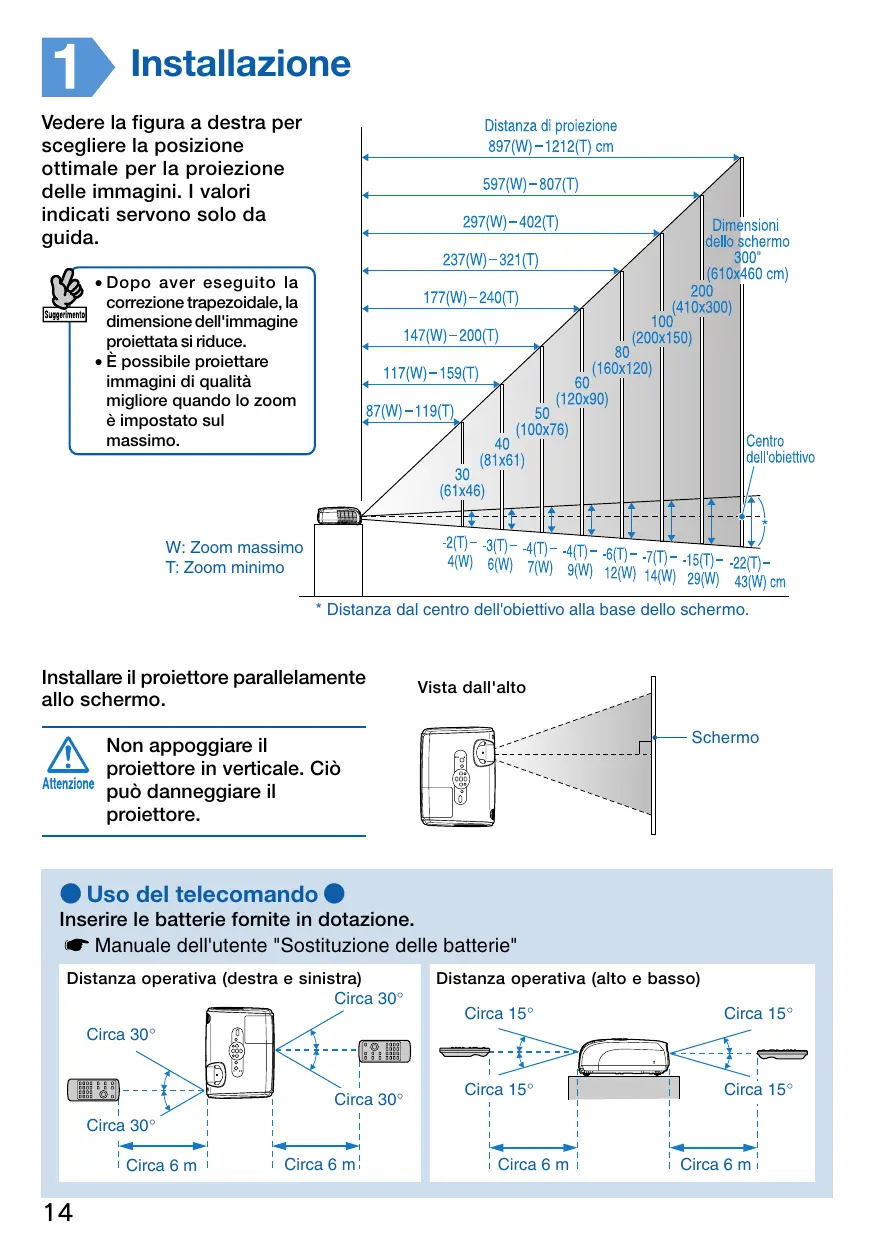 Installazione Vedere la figura a destra per scegliere la posizione ottimale per la proiezione delle immagini. I valori indicati servono solo da guida. • Dopo aver eseguito la correzione trapezoidale, la dimensione dell'immagine proiettata si riduce. • È possibile proiettare immagini di qualità migliore quando lo zoom è impostato sul massimo.