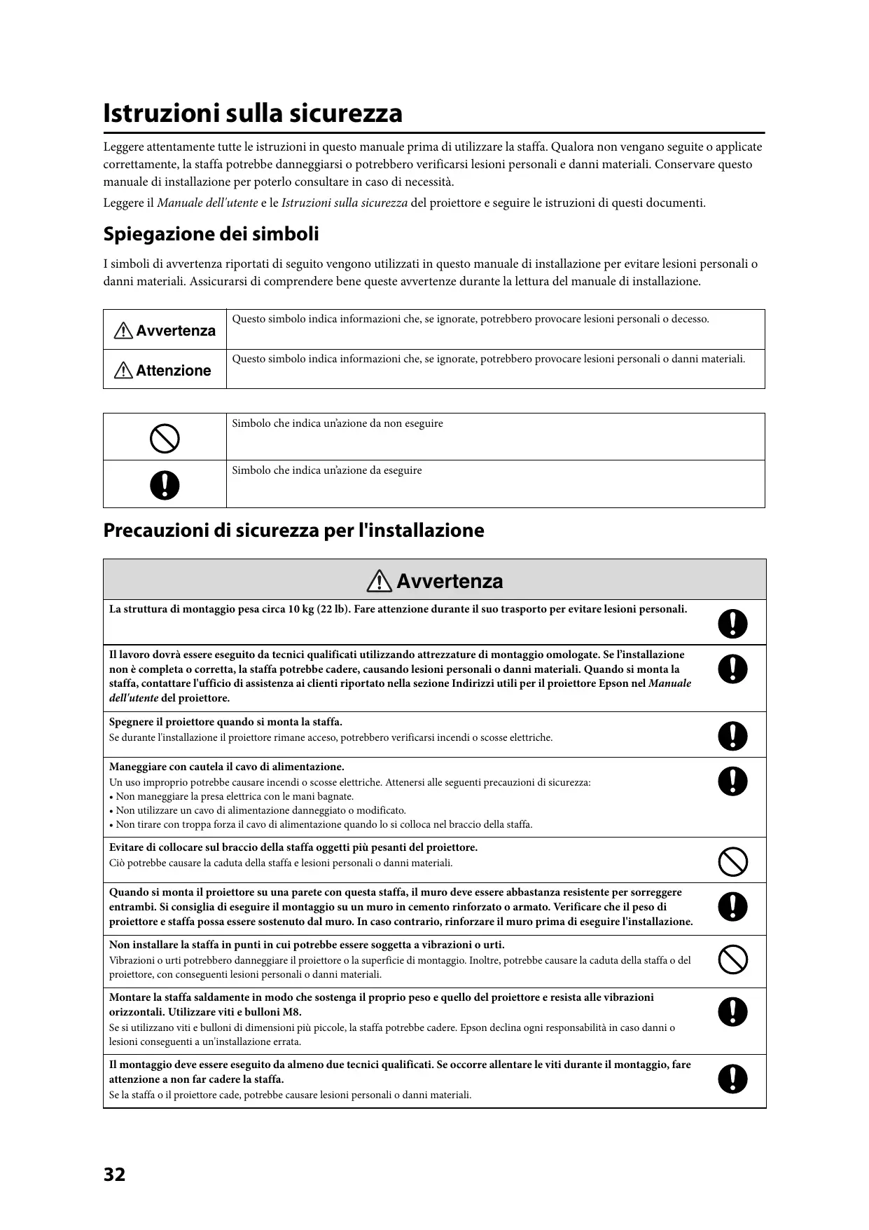 Istruzioni sulla sicurezza Leggere attentamente tutte le istruzioni in questo manuale prima di utilizzare la staffa. Qualora non vengano seguite o applicate correttamente, la staffa potrebbe danneggiarsi o potrebbero verificarsi lesioni personali e danni materiali. Conservare questo manuale di installazione per poterlo consultare in caso di necessità. Leggere il Manuale dell'utente e le Istruzioni sulla sicurezza del proiettore e seguire le istruzioni di questi documenti. Spiegazione dei simboli I simboli di avvertenza riportati di seguito vengono utilizzati in questo manuale di installazione per evitare lesioni personali o danni materiali. Assicurarsi di comprendere bene queste avvertenze durante la lettura del manuale di installazione. Avvertenza Attenzione Questo simbolo indica informazioni che, se ignorate, potrebbero provocare lesioni personali o decesso. Questo simbolo indica informazioni che, se ignorate, potrebbero provocare lesioni personali o danni materiali. Simbolo che indica un’azione da non eseguire Simbolo che indica un’azione da eseguire Precauzioni di sicurezza per l'installazione Avvertenza La struttura di montaggio pesa circa 10 kg (22 lb). Fare attenzione durante il suo trasporto per evitare lesioni personali. Il lavoro dovrà essere eseguito da tecnici qualificati utilizzando attrezzature di montaggio omologate. Se l’installazione non è completa o corretta, la staffa potrebbe cadere, causando lesioni personali o danni materiali. Quando si monta la staffa, contattare l'ufficio di assistenza ai clienti riportato nella sezione Indirizzi utili per il proiettore Epson nel Manuale dell'utente del proiettore. Spegnere il proiettore quando si monta la staffa. Se durante l'installazione il proiettore rimane acceso, potrebbero verificarsi incendi o scosse elettriche. Maneggiare con cautela il cavo di alimentazione. Un uso improprio potrebbe causare incendi o scosse elettriche. Attenersi alle seguenti precauzioni di sicurezza: