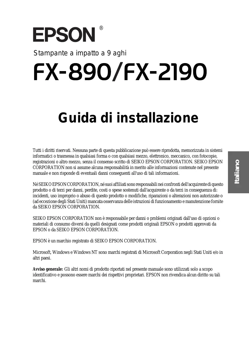 Stampante a impatto a 9 aghi Tutti i diritti riservati. Nessuna parte di questa pubblicazione può essere riprodotta, memorizzata in sistemi informatici o trasmessa in qualsiasi forma o con qualsiasi mezzo, elettronico, meccanico, con fotocopie, registrazioni o altro mezzo, senza il consenso scritto di SEIKO EPSON CORPORATION. SEIKO EPSON CORPORATION non si assume alcuna responsabilità in merito alle informazioni contenute nel presente manuale e non risponde di eventuali danni conseguenti all'uso di tali informazioni. Né SEIKO EPSON CORPORATION, né suoi affiliati sono responsabili nei confronti dell'acquirente di questo prodotto o di terzi per danni, perdite, costi o spese sostenuti dall'acquirente o da terzi in conseguenza di: incidenti, uso improprio o abuso di questo prodotto o modifiche, riparazioni o alterazioni non autorizzate o (ad eccezione degli Stati Uniti) mancata osservanza delle istruzioni di funzionamento e manutenzione fornite da SEIKO EPSON CORPORATION. SEIKO EPSON CORPORATION non è responsabile per danni o problemi originati dall'uso di opzioni o materiali di consumo diversi da quelli designati come prodotti originali EPSON o prodotti approvati da EPSON o da SEIKO EPSON CORPORATION. EPSON è un marchio registrato di SEIKO EPSON CORPORATION. Microsoft, Windows e Windows NT sono marchi registrati di Microsoft Corporation negli Stati Uniti e/o in altri paesi. Avviso generale: Gli altri nomi di prodotto riportati nel presente manuale sono utilizzati solo a scopo identificativo e possono essere marchi dei rispettivi proprietari. EPSON non rivendica alcun diritto su tali marchi. Italiano Guida di installazione