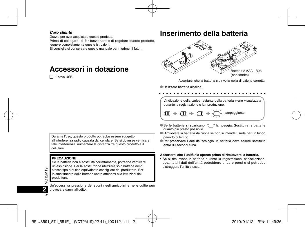 - Utilizzare batteria alcaline. L’indicazione della carica restante della batteria viene visualizzata durante la registrazione o la riproduzione. lampeggiante VQT2M19 Durante l’uso, questo prodotto potrebbe essere soggetto all’interferenza radio causata dal cellulare. Se si dovesse verificare tale interferenza, aumentare la distanza tra questo prodotto e il cellulare.