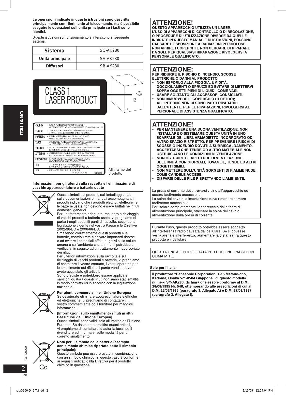 rqtx0200-D_1DE.indd 19 1/13/09 12:09:34 PM Le operazioni indicate in queste istruzioni sono descritte principalmente con riferimento al telecomando, ma è possibile eseguire le operazioni sull’unità principale se i tasti sono identici. Sistema SC-AK280 Unità principale SA-AK280 Diffusori SB-AK280 ITALIANO ESPAÑOL Queste istruzioni sul funzionamento si riferiscono al seguente sistema. ESPAÑOL All’interno del prodotto RQTX0200 ESPAÑOL ESPAÑOL Informazioni per gli utenti sulla raccolta e l’eliminazione di vecchie apparecchiature e batterie usate