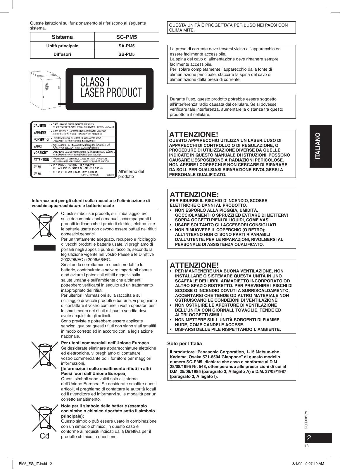 PM5_EG_GE.indd 12 3/4/09 3:07:28 PM Sistema SC-PM5 Unità principale SA-PM5 Diffusori SB-PM5 QUESTA UNITÀ È PROGETTATA PER L’USO NEI PAESI CON CLIMA MITE. La presa di corrente deve trovarsi vicino all’apparecchio ed essere facilmente accessibile. La spina del cavo di alimentazione deve rimanere sempre facilmente accessibile. Per isolare completamente l’apparecchio dalla fonte di alimentazione principale, staccare la spina del cavo di alimentazione dalla presa di corrente. DEUTSCH Queste istruzioni sul funzionamento si riferiscono al seguente sistema. Durante I’uso, questo prodotto potrebbe essere soggetto all’interferenza radio causata dal cellulare. Se si dovesse verificare tale interferenza, aumentare la distanza tra questo prodotto e il cellulare. All’interno del prodotto ITALIANO ATTENZIONE! QUESTO APPARECCHIO UTILIZZA UN LASER.L’USO DI APPARECCHI DI CONTROLLO O DI REGOLAZIONE, O