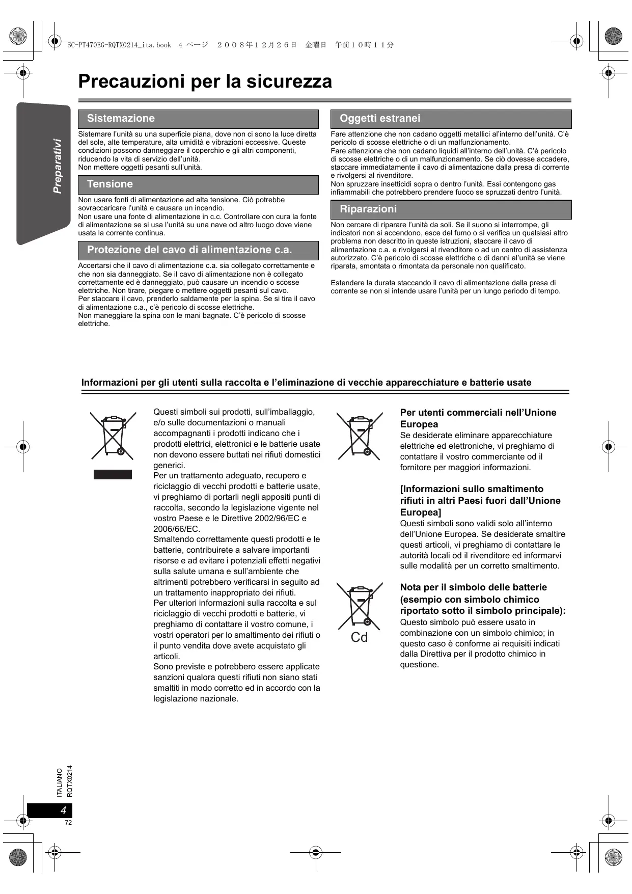 Questo simbolo può essere usato in combinazione con un simbolo chimico; in questo caso è conforme ai requisiti indicati dalla Direttiva per il prodotto chimico in questione. SC-PT470EG-RQTX0214_ita.book 5 ページ 2008年12月26日