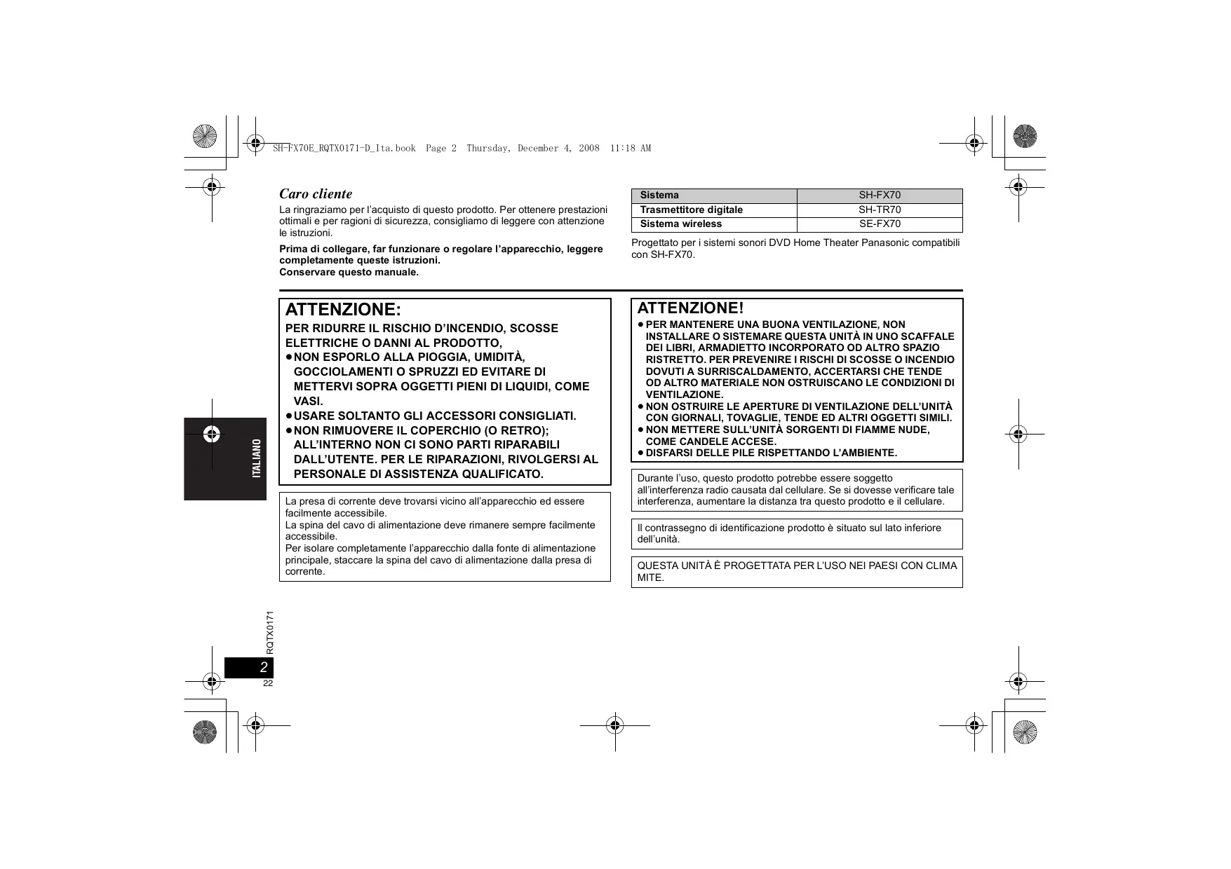 SH-FX70E_RQTX0171-D_Ita.book Page 2 Thursday, December 4, 2008 Caro cliente La ringraziamo per l’acquisto di questo prodotto. Per ottenere prestazioni ottimali e per ragioni di sicurezza, consigliamo di leggere con attenzione le istruzioni. Prima di collegare, far funzionare o regolare l’apparecchio, leggere completamente queste istruzioni. Conservare questo manuale. ATTENZIONE: ITALIANO PER RIDURRE IL RISCHIO D’INCENDIO, SCOSSE ELETTRICHE O DANNI AL PRODOTTO, ≥NON ESPORLO ALLA PIOGGIA, UMIDITÀ,
