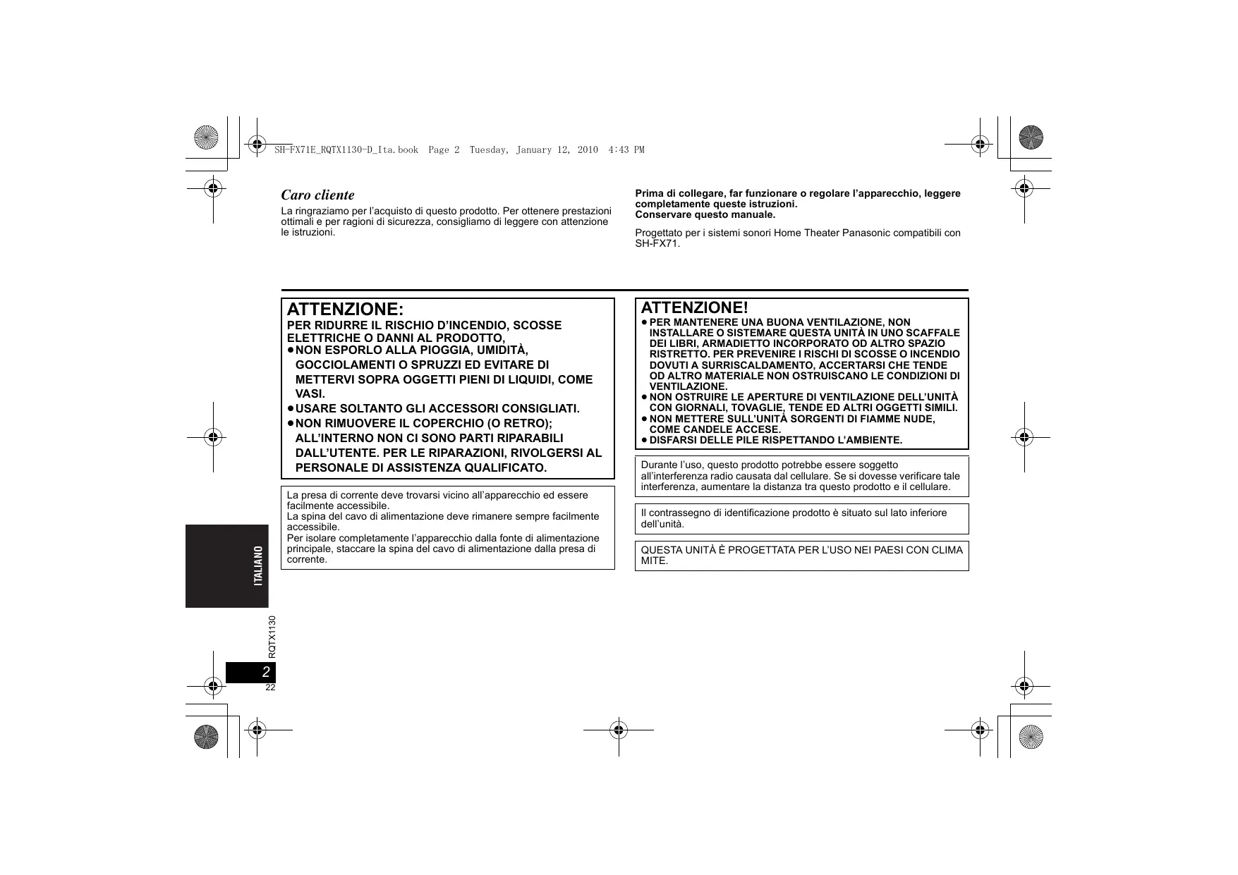 Prima di collegare, far funzionare o regolare l’apparecchio, leggere completamente queste istruzioni. Conservare questo manuale. Progettato per i sistemi sonori Home Theater Panasonic compatibili con SH-FX71. ATTENZIONE!