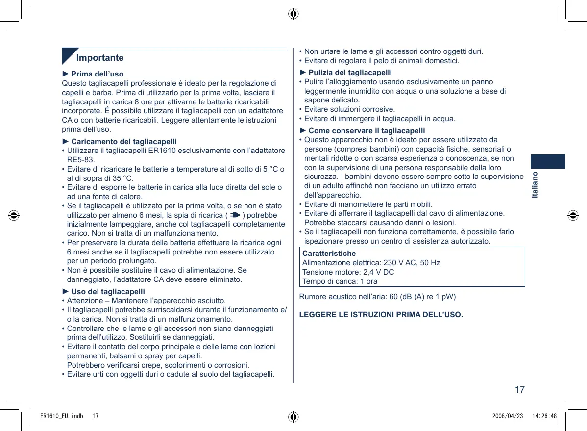Questo tagliacapelli professionale è ideato per la regolazione di capelli e barba. Prima di utilizzarlo per la prima volta, lasciare il tagliacapelli in carica 8 ore per attivarne le batterie ricaricabili incorporate. É possible utilizzato il tagliacapelli con un adattatore CA o con batterie ricaricabili. Leggere attentamente le istruzioni prima dell'uso.