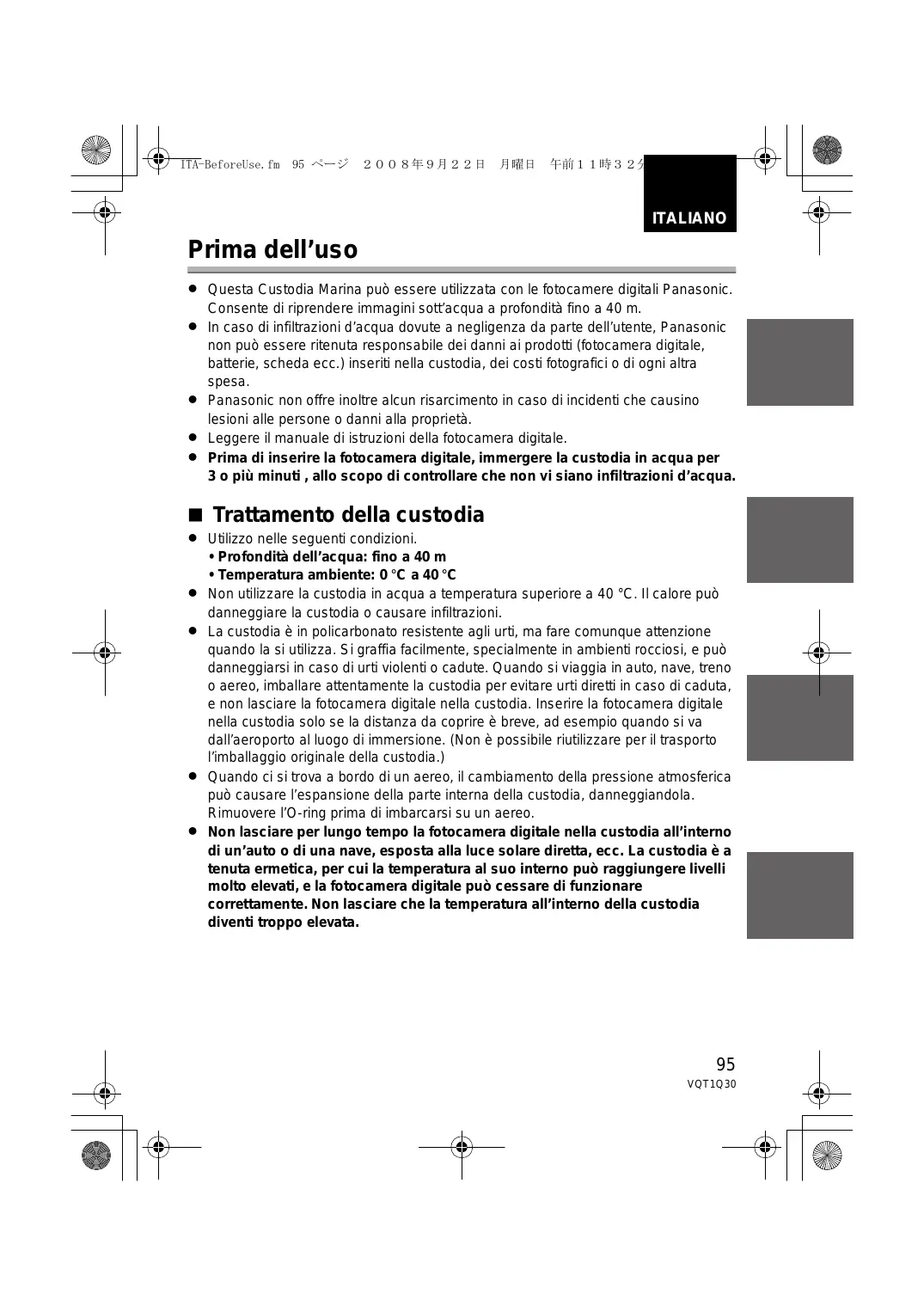 ITALIANO Prima dell’uso ≥ Questa Custodia Marina può essere utilizzata con le fotocamere digitali Panasonic. Consente di riprendere immagini sott’acqua a profondità fino a 40 m. ≥ In caso di infiltrazioni d’acqua dovute a negligenza da parte dell’utente, Panasonic non può essere ritenuta responsabile dei danni ai prodotti (fotocamera digitale, batterie, scheda ecc.) inseriti nella custodia, dei costi fotografici o di ogni altra spesa. ≥ Panasonic non offre inoltre alcun risarcimento in caso di incidenti che causino lesioni alle persone o danni alla proprietà. ≥ Leggere il manuale di istruzioni della fotocamera digitale. ≥ Prima di inserire la fotocamera digitale, immergere la custodia in acqua per 3 o più minuti , allo scopo di controllare che non vi siano infiltrazioni d’acqua. ∫ Trattamento della custodia ≥ Utilizzo nelle seguenti condizioni.