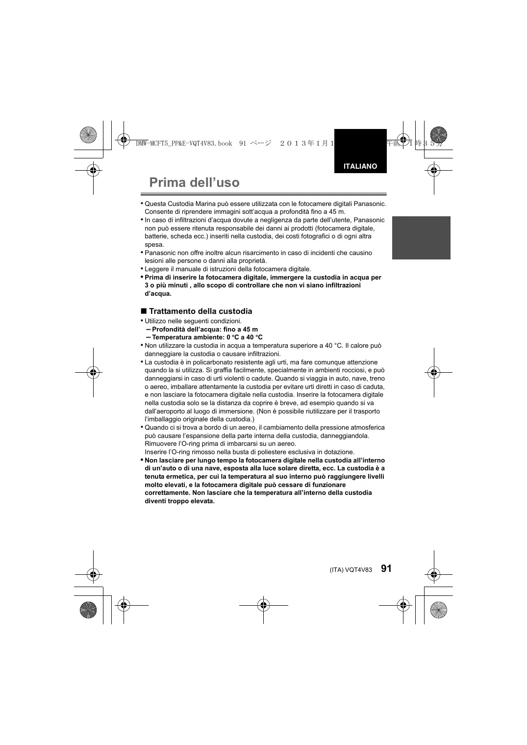 - In caso di infiltrazioni d’acqua dovute a negligenza da parte dell’utente, Panasonic non può essere ritenuta responsabile dei danni ai prodotti (fotocamera digitale, batterie, scheda ecc.) inseriti nella custodia, dei costi fotografici o di ogni altra spesa.