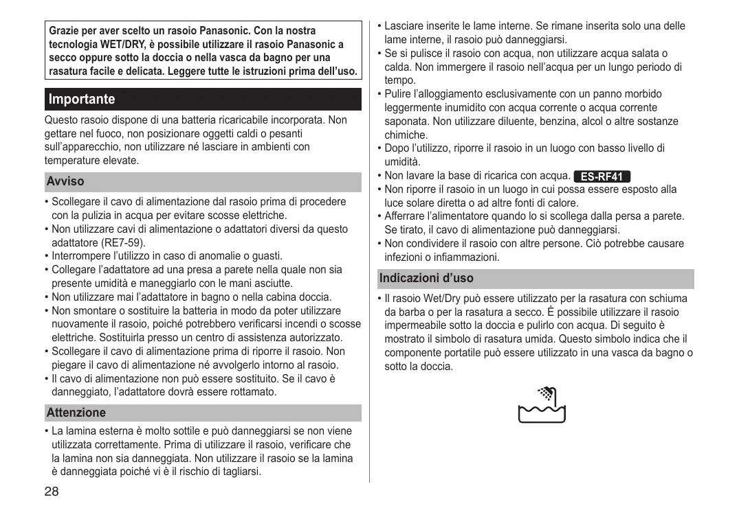 manipulation inappropriée des déchets. Pour de plus amples renseignements sur la collecte et le recyclage des piles et appareils usagés, veuillez vous renseigner auprès de votre mairie, du service municipal d’enlèvement des déchets ou du point de vente où vous avez acheté les articles concernés. Le non-respect de la réglementation relative à l’élimination des déchets est passible d’une peine d’amende. Pour les utilisateurs professionnels au sein de l’Union européenne Si vous souhaitez vous défaire de pièces d’équipement électrique ou électronique, veuillez vous renseigner directement auprès de votre détaillant ou de votre fournisseur. [Information relative à l’élimination des déchets dans les pays extérieurs à l’Union européenne] Ce pictogramme n’est valide qu’à l’intérieur de l’Union européenne. Pour connaître la procédure applicable dans les pays hors Union Européenne, veuillez vous renseigner auprès des autorités locales compétentes ou de votre distributeur. Grazie per aver scelto un rasoio Panasonic. Con la nostra tecnologia WET/DRY, è possibile utilizzare il rasoio Panasonic a secco oppure sotto la doccia o nella vasca da bagno per una rasatura facile e delicata. Leggere tutte le istruzioni prima dell’uso. Importante Questo rasoio dispone di una batteria ricaricabile incorporata. Non gettare nel fuoco, non posizionare oggetti caldi o pesanti sull’apparecchio, non utilizzare né lasciare in ambienti con temperature elevate. Avviso