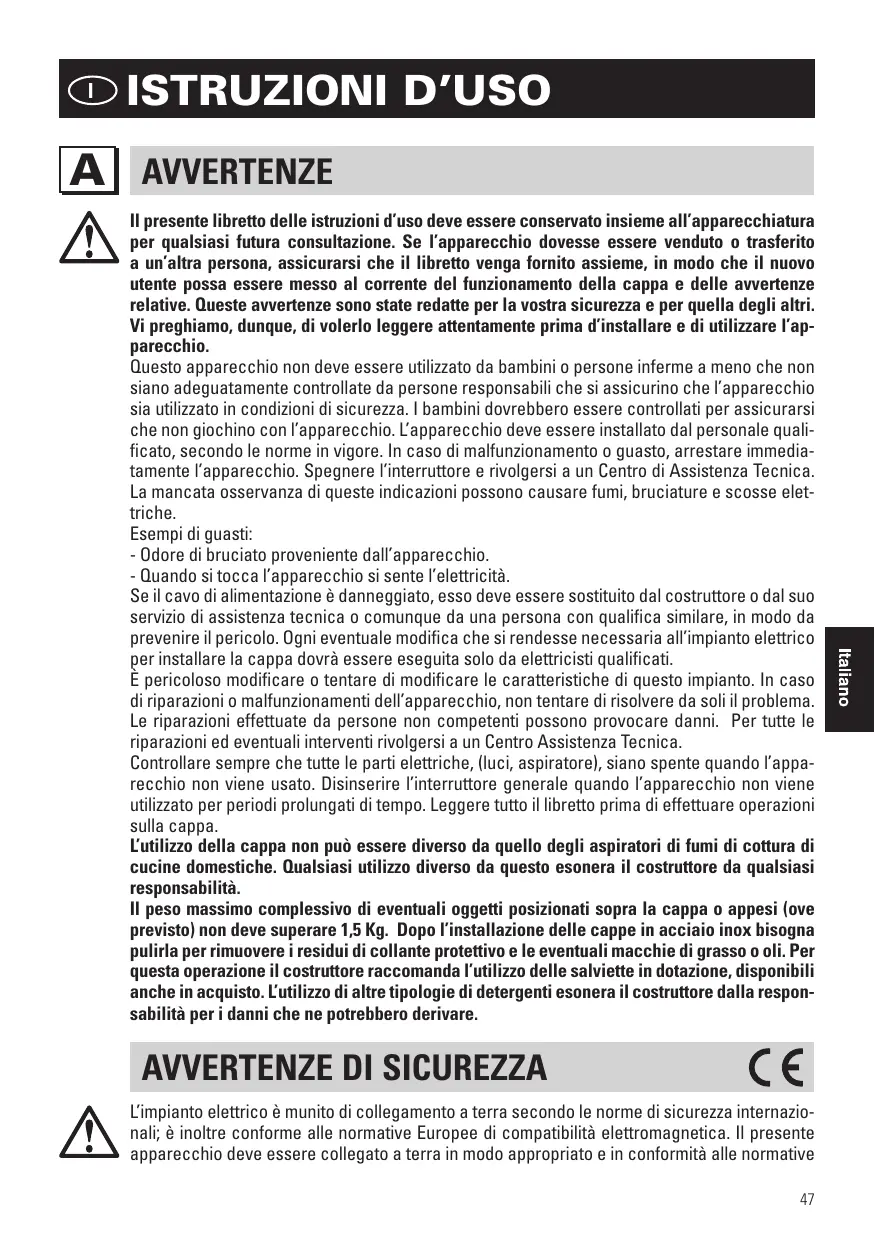 A AVVERTENZE Il presente libretto delle istruzioni d’uso deve essere conservato insieme all’apparecchiatura per qualsiasi futura consultazione. Se l’apparecchio dovesse essere venduto o trasferito a un’altra persona, assicurarsi che il libretto venga fornito assieme, in modo che il nuovo utente possa essere messo al corrente del funzionamento della cappa e delle avvertenze relative. Queste avvertenze sono state redatte per la vostra sicurezza e per quella degli altri. Vi preghiamo, dunque, di volerlo leggere attentamente prima d’installare e di utilizzare l’apparecchio. Questo apparecchio non deve essere utilizzato da bambini o persone inferme a meno che non siano adeguatamente controllate da persone responsabili che si assicurino che l’apparecchio sia utilizzato in condizioni di sicurezza. I bambini dovrebbero essere controllati per assicurarsi che non giochino con l’apparecchio. L’apparecchio deve essere installato dal personale qualificato, secondo le norme in vigore. In caso di malfunzionamento o guasto, arrestare immediatamente l’apparecchio. Spegnere l’interruttore e rivolgersi a un Centro di Assistenza Tecnica. La mancata osservanza di queste indicazioni possono causare fumi, bruciature e scosse elettriche. Esempi di guasti: - Odore di bruciato proveniente dall’apparecchio. - Quando si tocca l’apparecchio si sente l’elettricità. Se il cavo di alimentazione è danneggiato, esso deve essere sostituito dal costruttore o dal suo servizio di assistenza tecnica o comunque da una persona con qualifica similare, in modo da prevenire il pericolo. Ogni eventuale modifica che si rendesse necessaria all’impianto elettrico per installare la cappa dovrà essere eseguita solo da elettricisti qualificati. È pericoloso modificare o tentare di modificare le caratteristiche di questo impianto. In caso di riparazioni o malfunzionamenti dell’apparecchio, non tentare di risolvere da soli il problema. Le riparazioni effettuate da persone non competenti possono provocare danni. Per tutte le riparazioni ed eventuali interventi rivolgersi a un Centro Assistenza Tecnica. Controllare sempre che tutte le parti elettriche, (luci, aspiratore), siano spente quando l’apparecchio non viene usato. Disinserire l’interruttore generale quando l’apparecchio non viene utilizzato per periodi prolungati di tempo. Leggere tutto il libretto prima di effettuare operazioni sulla cappa. L’utilizzo della cappa non può essere diverso da quello degli aspiratori di fumi di cottura di cucine domestiche. Qualsiasi utilizzo diverso da questo esonera il costruttore da qualsiasi responsabilità. Il peso massimo complessivo di eventuali oggetti posizionati sopra la cappa o appesi (ove previsto) non deve superare 1,5 Kg. Dopo l’installazione delle cappe in acciaio inox bisogna pulirla per rimuovere i residui di collante protettivo e le eventuali macchie di grasso o oli. Per questa operazione il costruttore raccomanda l’utilizzo delle salviette in dotazione, disponibili anche in acquisto. L’utilizzo di altre tipologie di detergenti esonera il costruttore dalla responsabilità per i danni che ne potrebbero derivare.