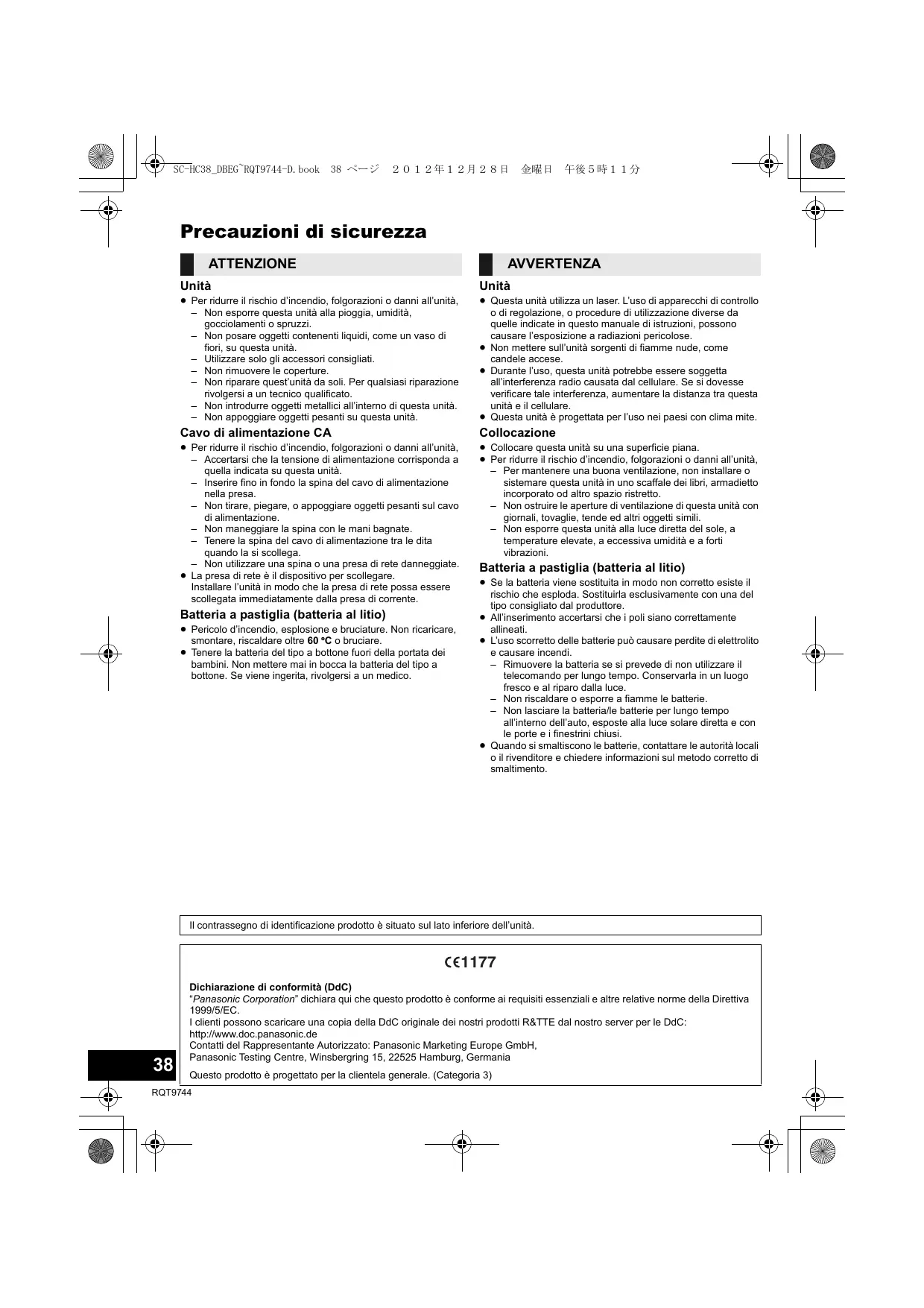 Dichiarazione di conformità (DdC) “Panasonic Corporation” dichiara qui che questo prodotto è conforme ai requisiti essenziali e altre relative norme della Direttiva 1999/5/EC. I clienti possono scaricare una copia della DdC originale dei nostri prodotti R&TTE dal nostro server per le DdC: http://www.doc.panasonic.de Contatti del Rappresentante Autorizzato: Panasonic Marketing Europe GmbH, Panasonic Testing Centre, Winsbergring 15, 22525 Hamburg, Germania Questo prodotto è progettato per la clientela generale. (Categoria 3) RQT9744 2012年12月28日