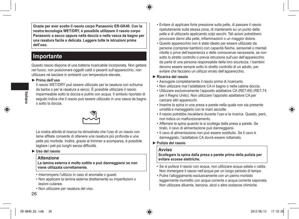 2012/06/13 17:18:26 Grazie per aver scelto il rasoio corpo Panasonic ER‑GK40. Con la nostra tecnologia WET/DRY, è possibile utilizzare il rasoio corpo Panasonic a secco oppure nella doccia o nella vasca da bagno per una rasatura facile e delicata. Leggere tutte le istruzioni prima dell’uso. Importante Italiano Questo rasoio dispone di una batteria ricaricabile incorporata. Non gettare nel fuoco, non posizionare oggetti caldi o pesanti sull’apparecchio, non utilizzare né lasciare in ambienti con temperature elevate. ► Prima dell’uso Il rasoio WET/DRY può essere utilizzato per la rasatura con schiuma da barba o per la rasatura a secco. È possibile utilizzare il rasoio impermeabile sotto la doccia e pulirlo con acqua. Il simbolo riportato di seguito indica che il rasoio può essere utilizzato in una vasca da bagno o sotto la doccia. La nostra attività di ricerca ha dimostrato che l’uso di un rasoio con lame affilate consente di ottenere una rasatura più profonda e una pelle più morbida. Inoltre, grazie al trimmer a scomparsa, è possibile tagliare i peli più lunghi senza difficoltà. ► Uso del rasoio Attenzione La lamina esterna è molto sottile e può danneggiarsi se non viene utilizzata correttamente.