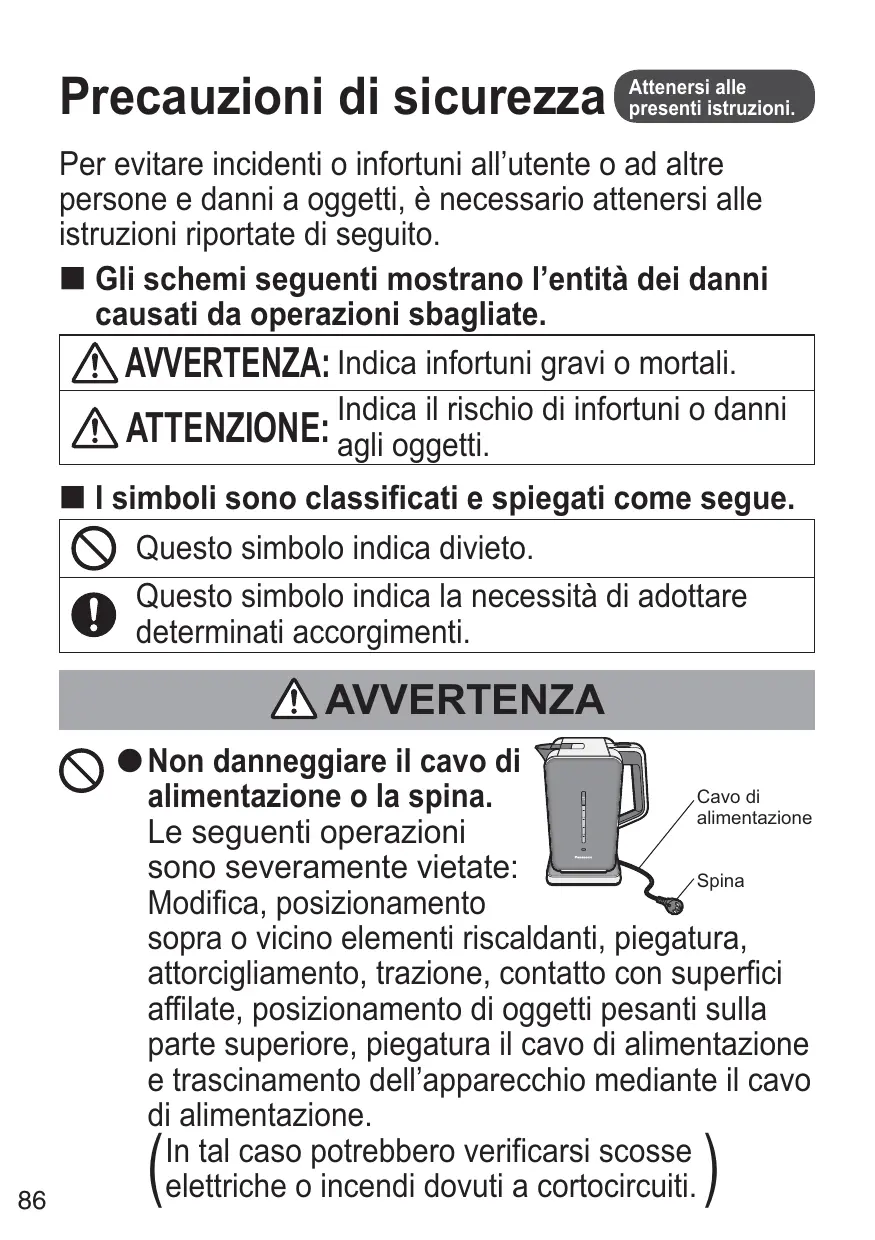 Precauzioni di sicurezza Attenersi alle presenti istruzioni. ATTENZIONE Non utilizzare l’apparecchio per qualsiasi scopo diverso da quelli previsti all’interno di queste istruzioni. La mancata osservanza di questo accorgimento potrebbe provocare ustioni o infortuni. ● Panasonic non accetta alcuna responsabilità nel caso in cui l’apparecchio sia stato soggetto a uso inappropriato o le presenti istruzioni non siano state rispettate. Non toccare le parti calde (beccuccio ecc.) durante o dopo l’uso. (Queste operazioni potrebbero provocare ustioni.)