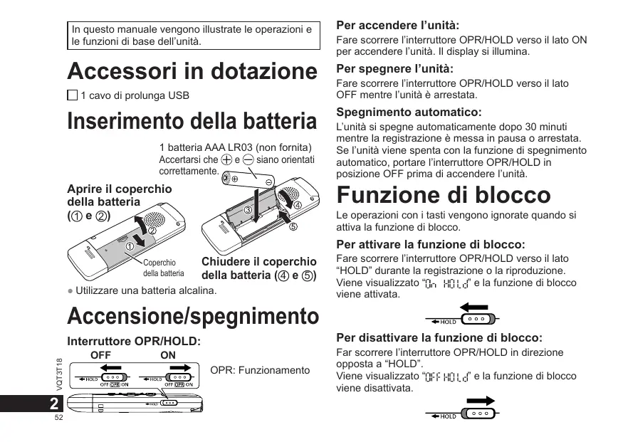 In questo manuale vengono illustrate le operazioni e le funzioni di base dell’unità. Per accendere l’unità: Accessori in dotazione Per spegnere l’unità: 1 cavo di prolunga USB Inserimento della batteria 1 batteria AAA LR03 (non fornita) Accertarsi che siano orientati correttamente. Fare scorrere l’interruttore OPR/HOLD verso il lato ON per accendere l’unità. Il display si illumina. Fare scorrere l’interruttore OPR/HOLD verso il lato OFF mentre l’unità è arrestata. Spegnimento automatico: L’unità si spegne automaticamente dopo 30 minuti mentre la registrazione è messa in pausa o arrestata. Se l’unità viene spenta con la funzione di spegnimento automatico, portare l’interruttore OPR/HOLD in posizione OFF prima di accendere l’unità. Funzione di blocco Aprire il coperchio della batteria (1 e 2) Le operazioni con i tasti vengono ignorate quando si attiva la funzione di blocco. Per attivare la funzione di blocco: Coperchio della batteria Chiudere il coperchio della batteria ( 4 e 5 ) ● Utilizzare una batteria alcalina. Fare scorrere l’interruttore OPR/HOLD verso il lato “HOLD” durante la registrazione o la riproduzione. ” e la funzione di blocco Viene visualizzato “ viene attivata. Accensione/spegnimento Per disattivare la funzione di blocco: VQT3T18 Interruttore OPR/HOLD:
