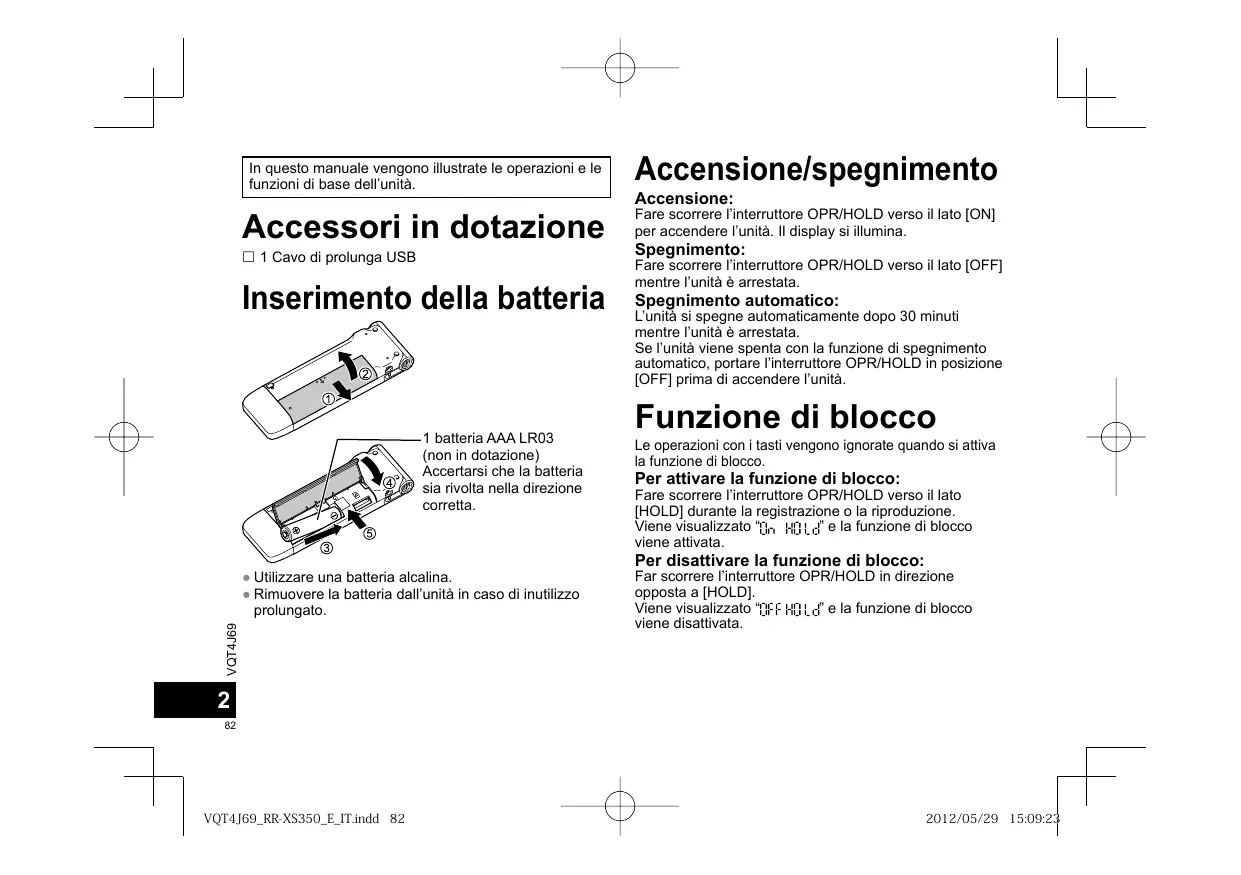 VQT4J69̲RR-XS350̲E̲GE.indd 81 2012/05/29 13:37:28 In questo manuale vengono illustrate le operazioni e le funzioni di base dell’unità. Accensione/spegnimento Accessori in dotazione Fare scorrere l’interruttore OPR/HOLD verso il lato [ON] per accendere l’unità. Il display si illumina. 1 Cavo di prolunga USB Inserimento della batteria 1 batteria AAA LR03 (non in dotazione) Accertarsi che la batteria sia rivolta nella direzione corretta. VQT4J69 ● Utilizzare una batteria alcalina. ● Rimuovere la batteria dall’unità in caso di inutilizzo prolungato. Accensione: Spegnimento: Fare scorrere l’interruttore OPR/HOLD verso il lato [OFF] mentre l’unità è arrestata. Spegnimento automatico: L’unità si spegne automaticamente dopo 30 minuti mentre l’unità è arrestata. Se l’unità viene spenta con la funzione di spegnimento automatico, portare l’interruttore OPR/HOLD in posizione [OFF] prima di accendere l’unità. Funzione di blocco Le operazioni con i tasti vengono ignorate quando si attiva la funzione di blocco. Per attivare la funzione di blocco: Fare scorrere l’interruttore OPR/HOLD verso il lato [HOLD] durante la registrazione o la riproduzione. Viene visualizzato “ ” e la funzione di blocco viene attivata. Per disattivare la funzione di blocco: Far scorrere l’interruttore OPR/HOLD in direzione opposta a [HOLD]. Viene visualizzato “ ” e la funzione di blocco viene disattivata.