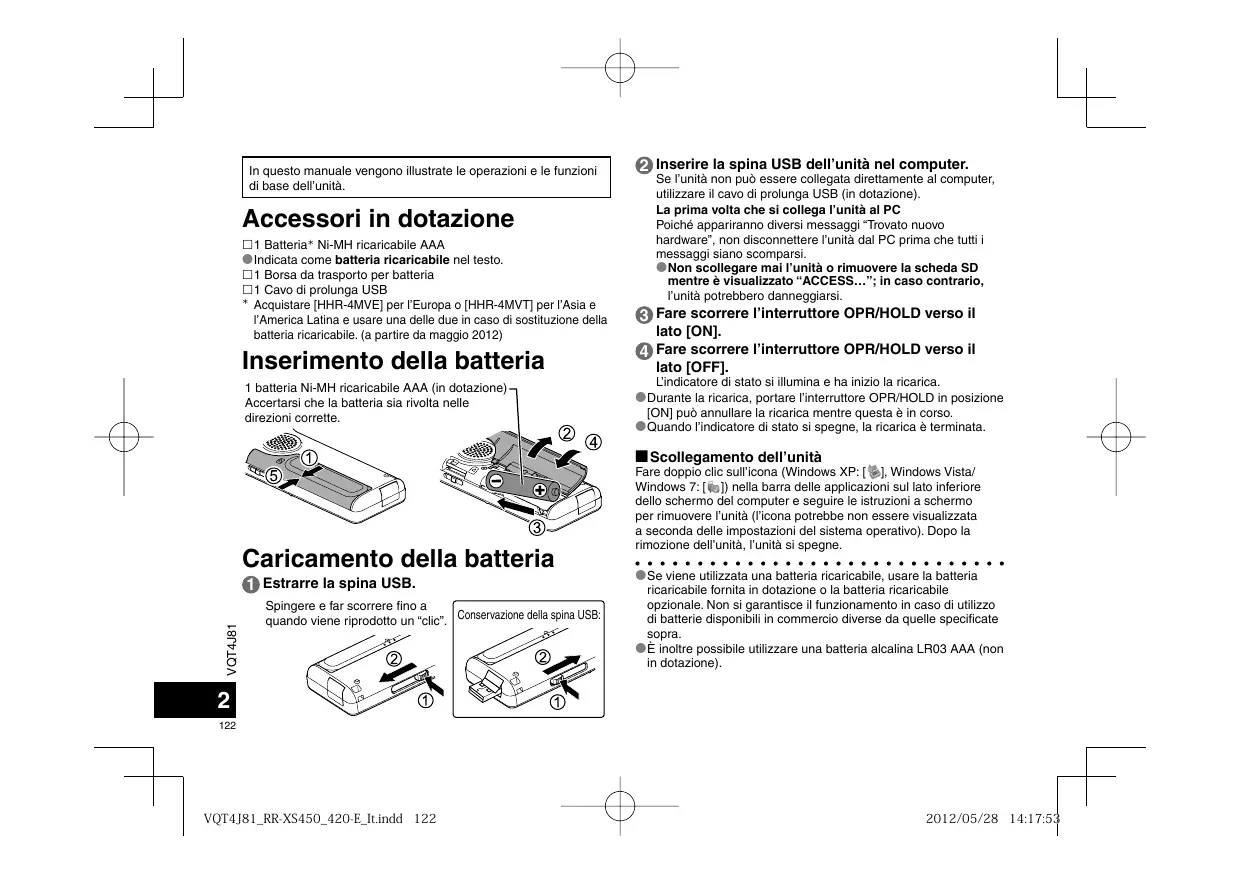 VQT4J81̲RR-XS450̲420-E̲GE.indd 121 2012/05/28 14:49:50 In questo manuale vengono illustrate le operazioni e le funzioni di base dell’unità. Accessori in dotazione 1 Batteria Ni-MH ricaricabile AAA *Indicata come batteria ricaricabile nel testo. 1 Borsa da trasporto per batteria 1 Cavo di prolunga USB Acquistare [HHR-4MVE] per l’Europa o [HHR-4MVT] per l’Asia e l’America Latina e usare una delle due in caso di sostituzione della batteria ricaricabile. (a partire da maggio 2012) Inserimento della batteria 1 batteria Ni-MH ricaricabile AAA (in dotazione) Accertarsi che la batteria sia rivolta nelle direzioni corrette. 2 Inserire la spina USB dell’unità nel computer. Se l’unità non può essere collegata direttamente al computer, utilizzare il cavo di prolunga USB (in dotazione). La prima volta che si collega l’unità al PC Poiché appariranno diversi messaggi “Trovato nuovo hardware”, non disconnettere l’unità dal PC prima che tutti i messaggi siano scomparsi. *Non scollegare mai l’unità o rimuovere la scheda SD mentre è visualizzato “ACCESS…”; in caso contrario, l’unità potrebbero danneggiarsi. 3 Fare scorrere l’interruttore OPR/HOLD verso il lato [ON]. 4 Fare scorrere l’interruttore OPR/HOLD verso il lato [OFF]. L’indicatore di stato si illumina e ha inizio la ricarica. *Durante la ricarica, portare l’interruttore OPR/HOLD in posizione [ON] può annullare la ricarica mentre questa è in corso. *Quando l’indicatore di stato si spegne, la ricarica è terminata. g Scollegamento dell’unità Caricamento della batteria VQT4J81 1 Estrarre la spina USB. Spingere e far scorrere fino a Conservazione della spina USB: quando viene riprodotto un “clic”. Fare doppio clic sull’icona (Windows XP: [ ], Windows Vista/ Windows 7: [ ]) nella barra delle applicazioni sul lato inferiore dello schermo del computer e seguire le istruzioni a schermo per rimuovere l’unità (l’icona potrebbe non essere visualizzata a seconda delle impostazioni del sistema operativo). Dopo la rimozione dell’unità, l’unità si spegne. *Se viene utilizzata una batteria ricaricabile, usare la batteria ricaricabile fornita in dotazione o la batteria ricaricabile opzionale. Non si garantisce il funzionamento in caso di utilizzo di batterie disponibili in commercio diverse da quelle specificate sopra. *È inoltre possibile utilizzare una batteria alcalina LR03 AAA (non in dotazione).