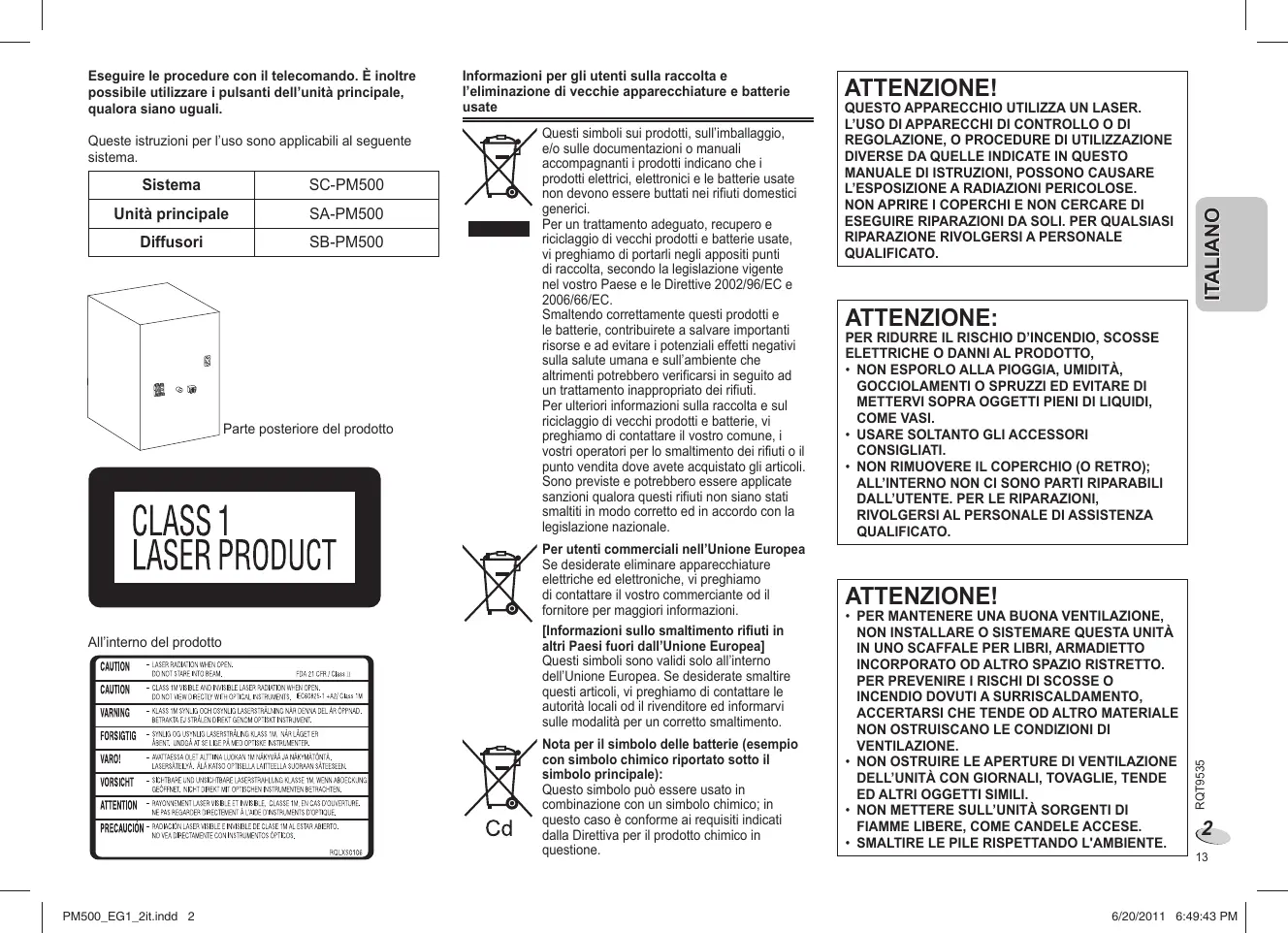PM500_EG1_1de.indd 12 6/20/2011 6:48:38 PM Sistema SC-PM500 Unità principale SA-PM500 Diffusori SB-PM500 Parte posteriore del prodotto All’interno del prodotto Questi simboli sui prodotti, sull’imballaggio, e/o sulle documentazioni o manuali accompagnanti i prodotti indicano che i prodotti elettrici, elettronici e le batterie usate non devono essere buttati nei rifiuti domestici generici. Per un trattamento adeguato, recupero e riciclaggio di vecchi prodotti e batterie usate, vi preghiamo di portarli negli appositi punti di raccolta, secondo la legislazione vigente nel vostro Paese e le Direttive 2002/96/EC e 2006/66/EC. Smaltendo correttamente questi prodotti e le batterie, contribuirete a salvare importanti risorse e ad evitare i potenziali effetti negativi sulla salute umana e sull’ambiente che altrimenti potrebbero verificarsi in seguito ad un trattamento inappropriato dei rifiuti. Per ulteriori informazioni sulla raccolta e sul riciclaggio di vecchi prodotti e batterie, vi preghiamo di contattare il vostro comune, i vostri operatori per lo smaltimento dei rifiuti o il punto vendita dove avete acquistato gli articoli. Sono previste e potrebbero essere applicate sanzioni qualora questi rifiuti non siano stati smaltiti in modo corretto ed in accordo con la legislazione nazionale. Per utenti commerciali nell’Unione Europea Se desiderate eliminare apparecchiature elettriche ed elettroniche, vi preghiamo di contattare il vostro commerciante od il fornitore per maggiori informazioni. [Informazioni sullo smaltimento rifiuti in altri Paesi fuori dall’Unione Europea] Questi simboli sono validi solo all’interno dell’Unione Europea. Se desiderate smaltire questi articoli, vi preghiamo di contattare le autorità locali od il rivenditore ed informarvi sulle modalità per un corretto smaltimento. Nota per il simbolo delle batterie (esempio con simbolo chimico riportato sotto il simbolo principale): Questo simbolo può essere usato in combinazione con un simbolo chimico; in questo caso è conforme ai requisiti indicati dalla Direttiva per il prodotto chimico in questione. PM500_EG1_2it.indd 2 ATTENZIONE! QUESTO APPARECCHIO UTILIZZA UN LASER. L’USO DI APPARECCHI DI CONTROLLO O DI