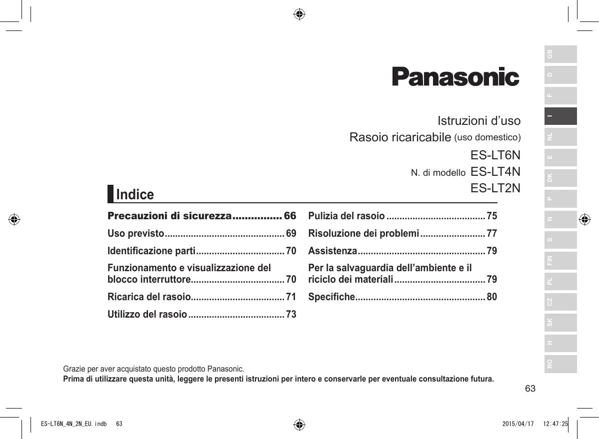 Indice Istruzioni d’uso Rasoio ricaricabile (uso domestico) ES‑LT6N N. di modello ES‑LT4N ES‑LT2N Grazie per aver acquistato questo prodotto Panasonic. Prima di utilizzare questa unità, leggere le presenti istruzioni per intero e conservarle per eventuale consultazione futura. ES-LT6N_4N_2N_EU.indb