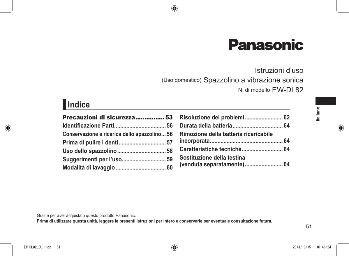 - 2013/10/15 10:46:24 (Uso domestico) Istruzioni d’uso Spazzolino a vibrazione sonica N. di modello EW‑DL82 Risoluzione dei problemi p. 62