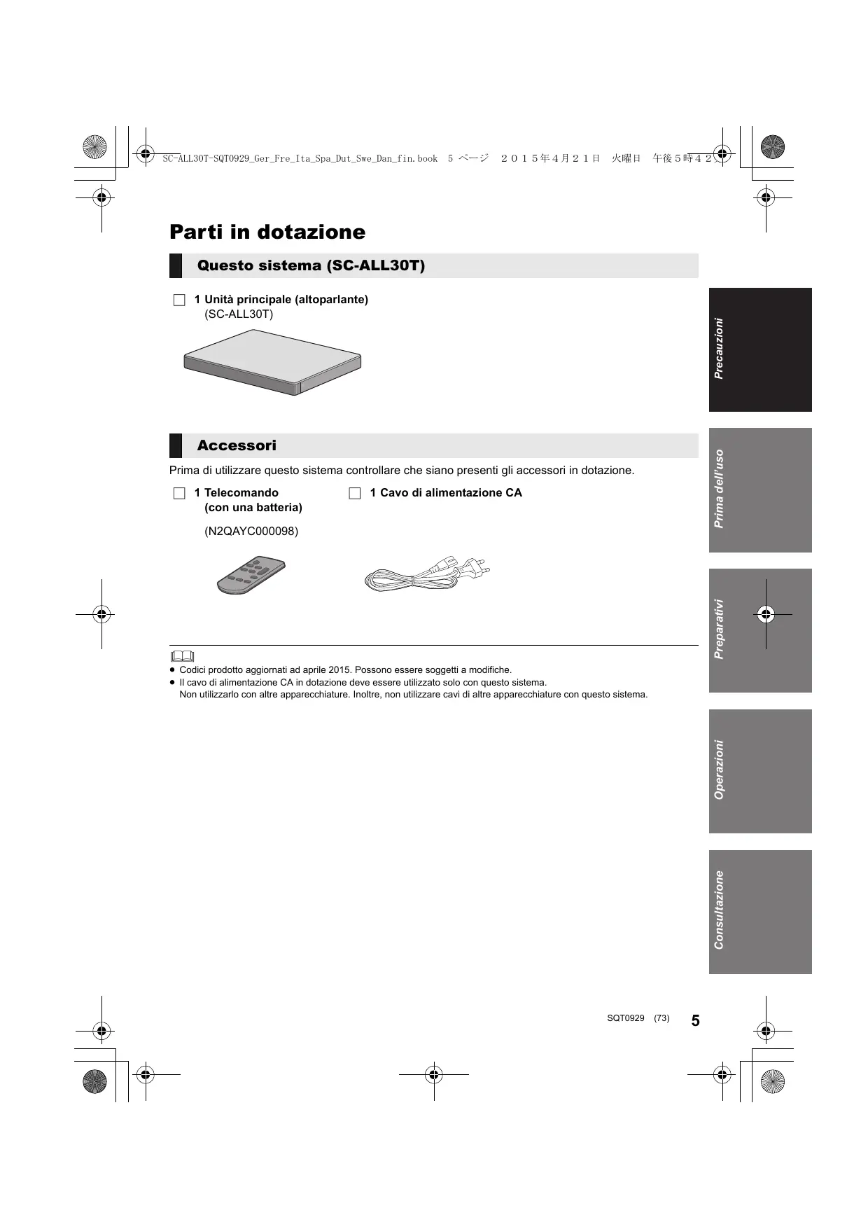 Prima dell’uso Questo sistema (SC-ALL30T) Precauzioni ∏ 1 Unità principale (altoparlante) (SC-ALL30T) Prima dell’uso Accessori Prima di utilizzare questo sistema controllare che siano presenti gli accessori in dotazione. ∏ 1 Telecomando (con una batteria) ∏ 1 Cavo di alimentazione CA Preparativi (N2QAYC000098) Consultazione Operazioni ≥ Codici prodotto aggiornati ad aprile 2015. Possono essere soggetti a modifiche. ≥ Il cavo di alimentazione CA in dotazione deve essere utilizzato solo con questo sistema. Non utilizzarlo con altre apparecchiature. Inoltre, non utilizzare cavi di altre apparecchiature con questo sistema. SQT0929 (73)