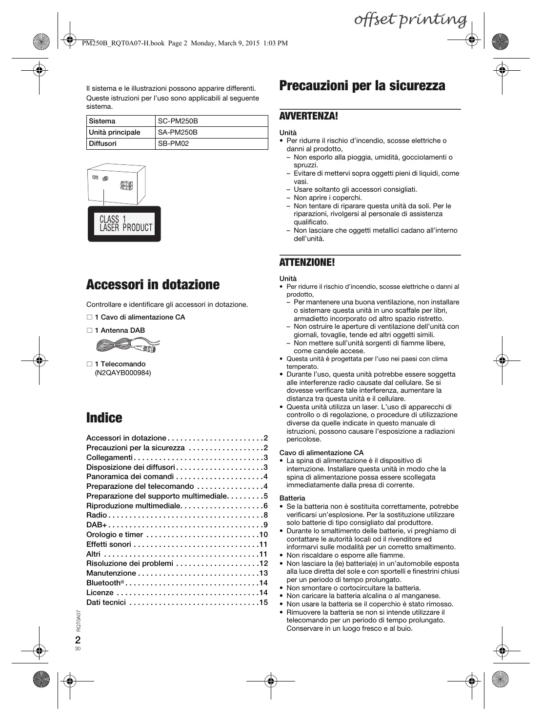 offset printing PM250B_RQT0A07-H.book Page 2 Monday, March 9, 2015 1:03 PM Il sistema e le illustrazioni possono apparire differenti. Queste istruzioni per l’uso sono applicabili al seguente sistema. Sistema SC-PM250B Unità principale SA-PM250B Diffusori SB-PM02 Precauzioni per la sicurezza AVVERTENZA! Unità