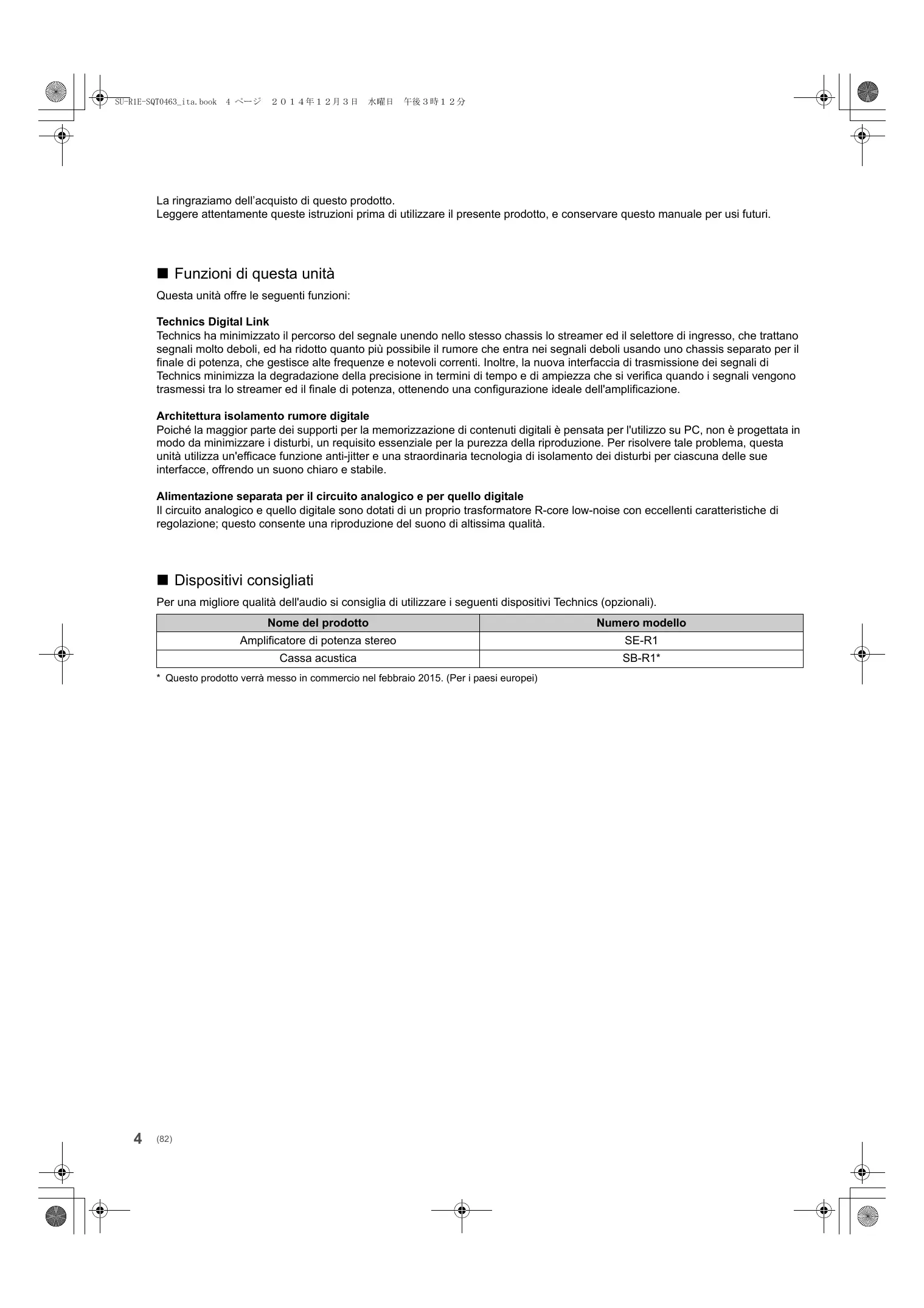La ringraziamo dell’acquisto di questo prodotto. Leggere attentamente queste istruzioni prima di utilizzare il presente prodotto, e conservare questo manuale per usi futuri. ∫ Funzioni di questa unità Questa unità offre le seguenti funzioni: Technics Digital Link Technics ha minimizzato il percorso del segnale unendo nello stesso chassis lo streamer ed il selettore di ingresso, che trattano segnali molto deboli, ed ha ridotto quanto più possibile il rumore che entra nei segnali deboli usando uno chassis separato per il finale di potenza, che gestisce alte frequenze e notevoli correnti. Inoltre, la nuova interfaccia di trasmissione dei segnali di Technics minimizza la degradazione della precisione in termini di tempo e di ampiezza che si verifica quando i segnali vengono trasmessi tra lo streamer ed il finale di potenza, ottenendo una configurazione ideale dell'amplificazione. Architettura isolamento rumore digitale Poiché la maggior parte dei supporti per la memorizzazione di contenuti digitali è pensata per l'utilizzo su PC, non è progettata in modo da minimizzare i disturbi, un requisito essenziale per la purezza della riproduzione. Per risolvere tale problema, questa unità utilizza un'efficace funzione anti-jitter e una straordinaria tecnologia di isolamento dei disturbi per ciascuna delle sue interfacce, offrendo un suono chiaro e stabile. Alimentazione separata per il circuito analogico e per quello digitale Il circuito analogico e quello digitale sono dotati di un proprio trasformatore R-core low-noise con eccellenti caratteristiche di regolazione; questo consente una riproduzione del suono di altissima qualità. ∫ Dispositivi consigliati Per una migliore qualità dell'audio si consiglia di utilizzare i seguenti dispositivi Technics (opzionali). Nome del prodotto Amplificatore di potenza stereo SE-R1 Cassa acustica SB-R1*