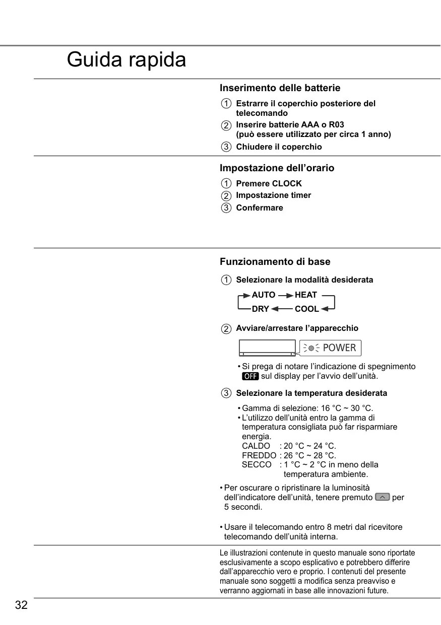 • Usare il telecomando entro 8 metri dal ricevitore telecomando dell’unità interna. Le illustrazioni contenute in questo manuale sono riportate esclusivamente a scopo esplicativo e potrebbero differire dall’apparecchio vero e proprio. I contenuti del presente manuale sono soggetti a modifica senza preavviso e verranno aggiornati in base alle innovazioni future.